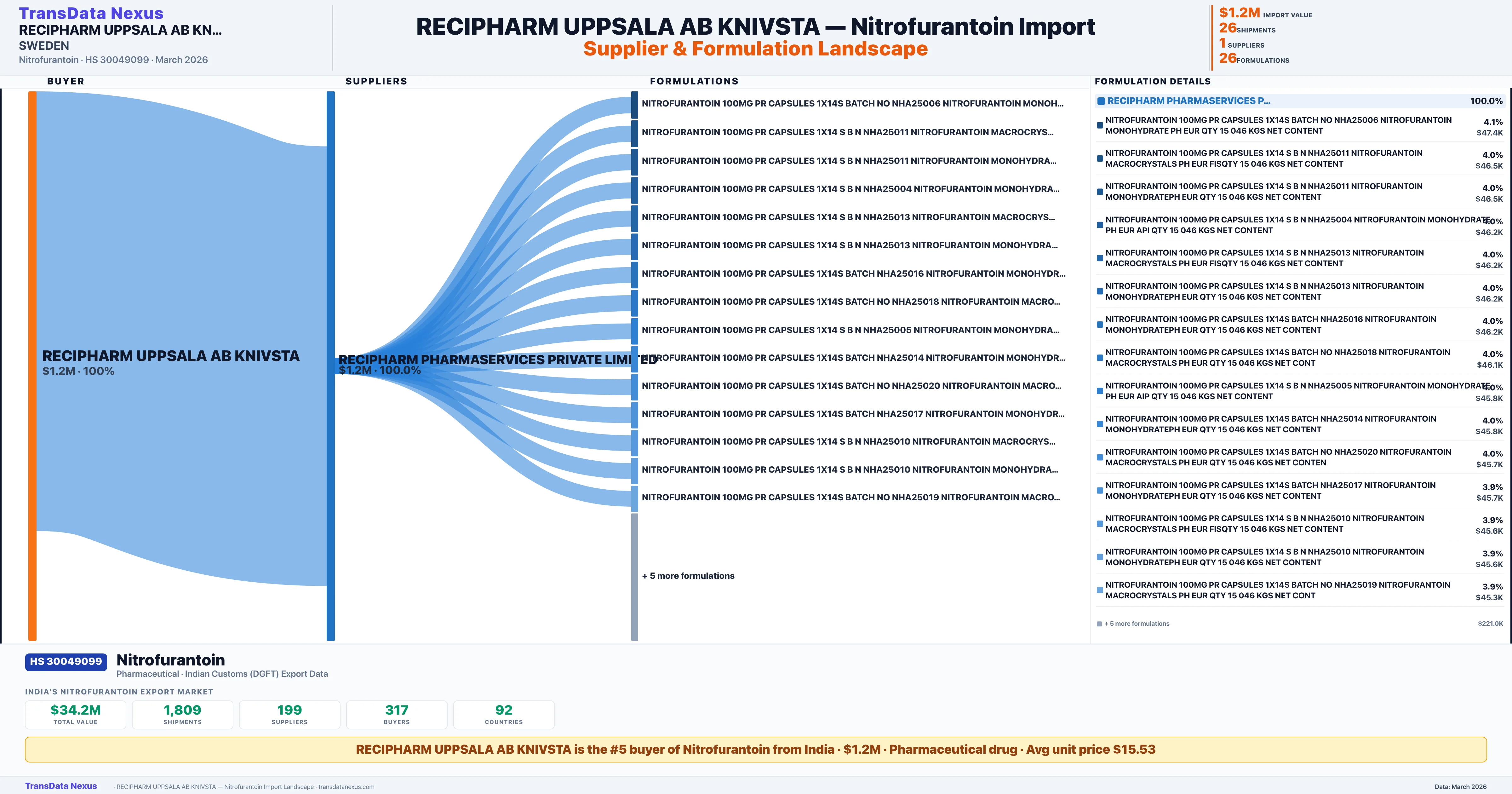 RECIPHARM UPPSALA AB KNIVSTA sources Nitrofurantoin from 1 verified Indian supplier: RECIPHARM PHARMASERVICES PRIVATE LIMITED ($1.2M, 100.0%). This is based on 26 customs records.