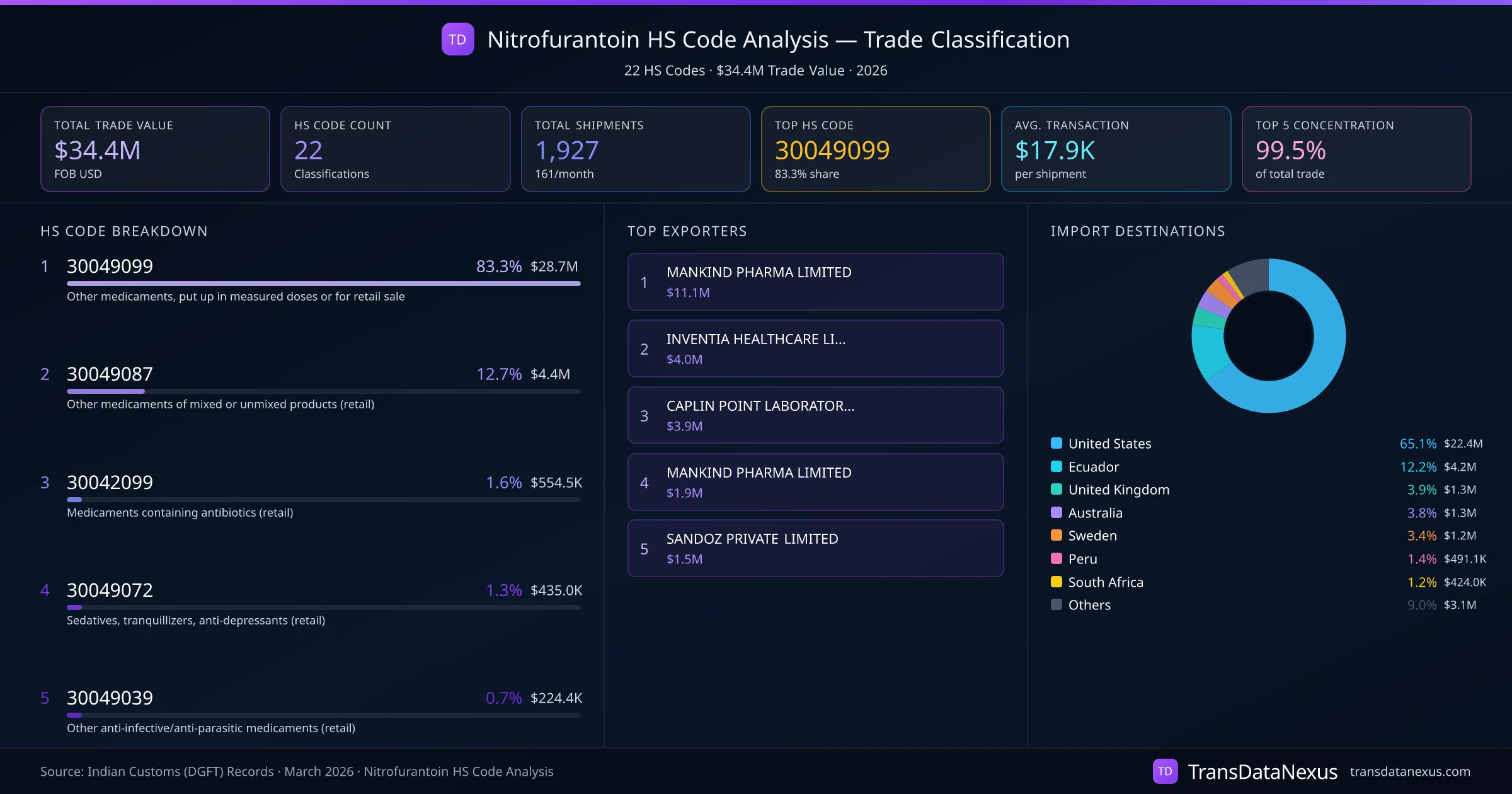India exports Nitrofurantoin under 22 distinct HS code classifications, representing a total trade value of $34.4M across 1,927 shipments. The dominant classification is HS 30049099 (Other medicaments, put up in measured doses or for retail sale), accounting for 83.3% of all Nitrofurantoin trade at $28.7M. HS 30049087 (Other medicaments of mixed or unmixed products (retail)) follows at 12.7% ($4.4M). The top 5 HS codes together account for 99.5% of total Nitrofurantoin trade from India. The average transaction value is $17858. Key importing markets include United States, Ecuador, United Kingdom. Leading exporters include MANKIND PHARMA LIMITED and INVENTIA HEALTHCARE LIMITED. Data sourced from Indian Customs (DGFT) shipping bill records.