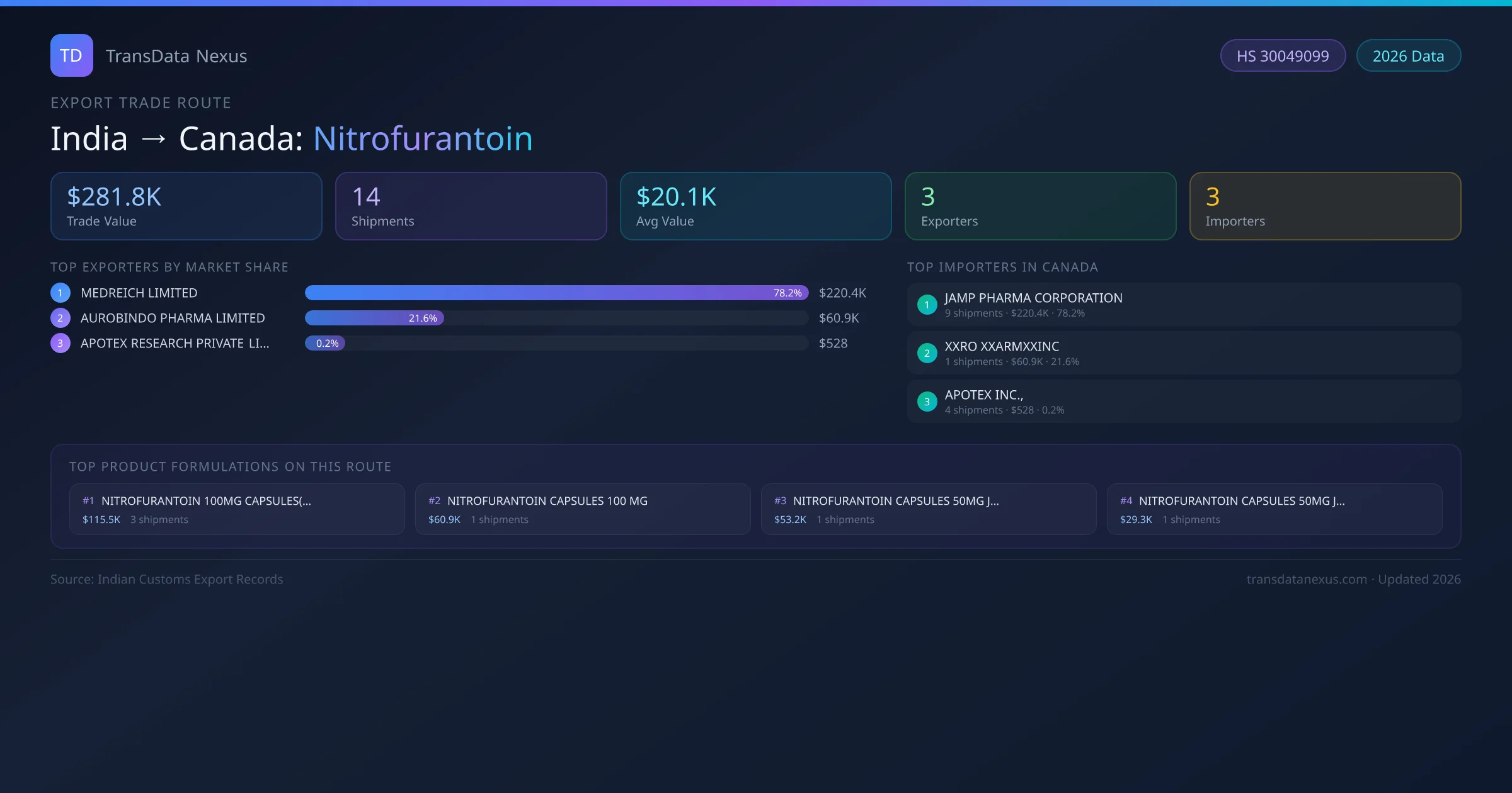 The India to Canada Nitrofurantoin corridor is one of India's established pharmaceutical export routes, with 14 shipments documented worth a combined $281.8K USD. The route is dominated by MEDREICH LIMITED, which alone accounts for roughly 78% of all export value, reflecting the consolidated nature of India's nitrofurantoin manufacturing sector.