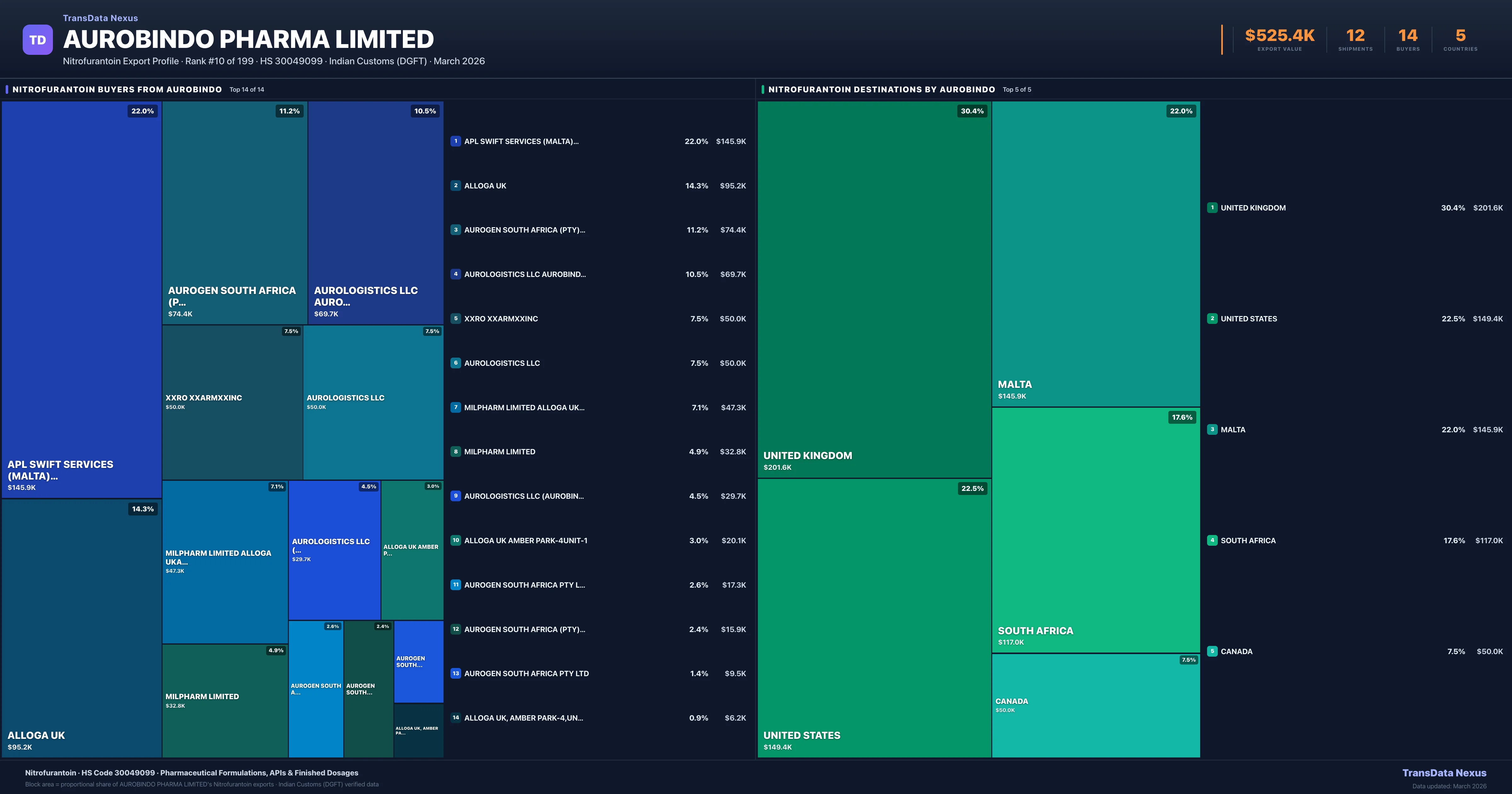 Access shipment-level details, pricing data, buyer connections, and competitive analysis for Aurobindo Pharma Limited's Nitrofurantoin exports. TransData Nexus provides verified Indian Customs (DGFT) data trusted by pharmaceutical trade professionals worldwide.