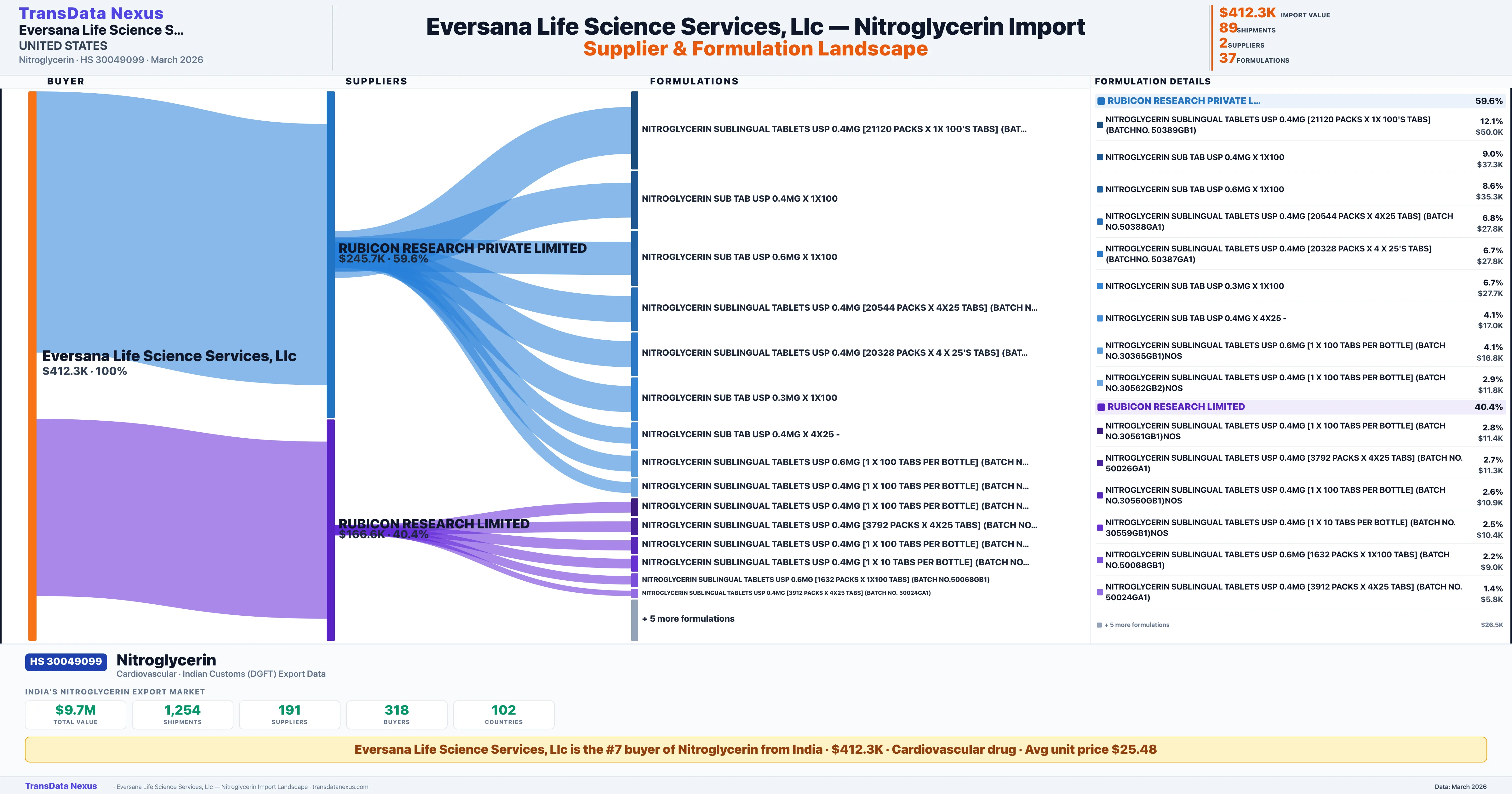 EVERSANA LIFE SCIENCE SERVICES LLC- sources Nitroglycerin from 2 verified Indian suppliers: RUBICON RESEARCH PRIVATE LIMITED ($245.7K, 59.6%), RUBICON RESEARCH LIMITED ($166.6K, 40.4%). This is based on 89 customs records.