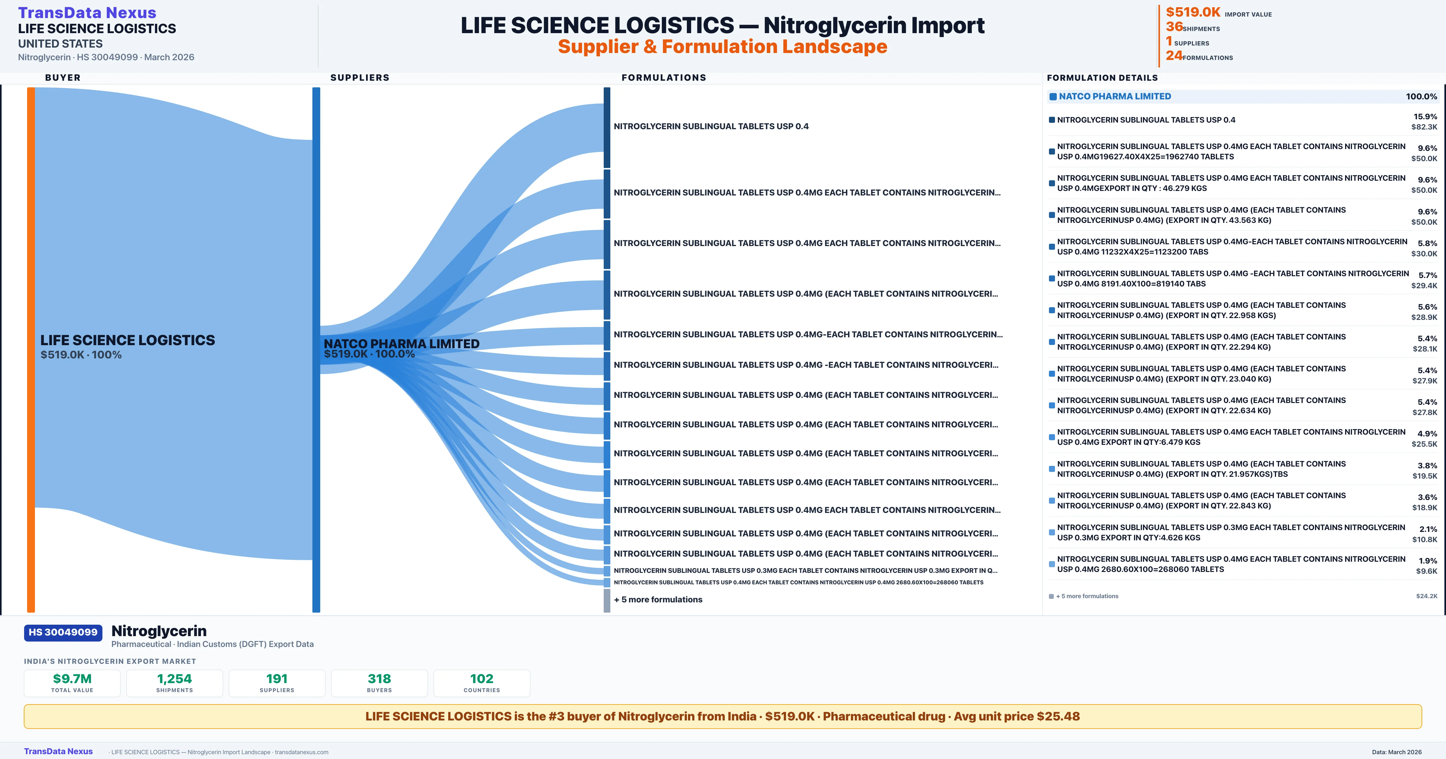 LIFE SCIENCE LOGISTICS sources Nitroglycerin from 1 verified Indian supplier: NATCO PHARMA LIMITED ($519.0K, 100.0%). This is based on 36 customs records.