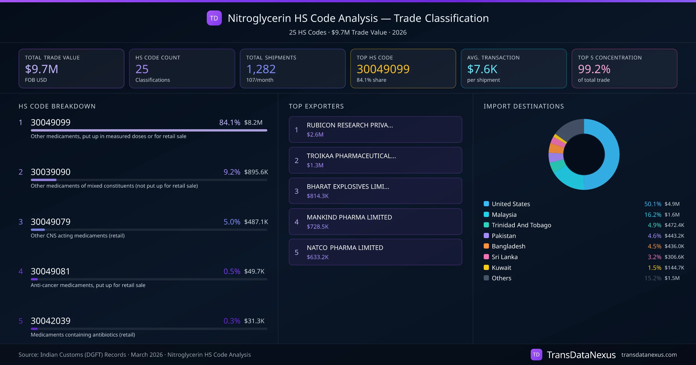 India exports Nitroglycerin under 25 distinct HS code classifications, representing a total trade value of $9.7M across 1,282 shipments. The dominant classification is HS 30049099 (Other medicaments, put up in measured doses or for retail sale), accounting for 84.1% of all Nitroglycerin trade at $8.2M. HS 30039090 (Other medicaments of mixed constituents (not put up for retail sale)) follows at 9.2% ($895.6K). The top 5 HS codes together account for 99.2% of total Nitroglycerin trade from India. The average transaction value is $7593. Key importing markets include United States, Malaysia, Trinidad And Tobago. Leading exporters include RUBICON RESEARCH PRIVATE LIMITED and TROIKAA PHARMACEUTICALS LIMITED. Data sourced from Indian Customs (DGFT) shipping bill records.