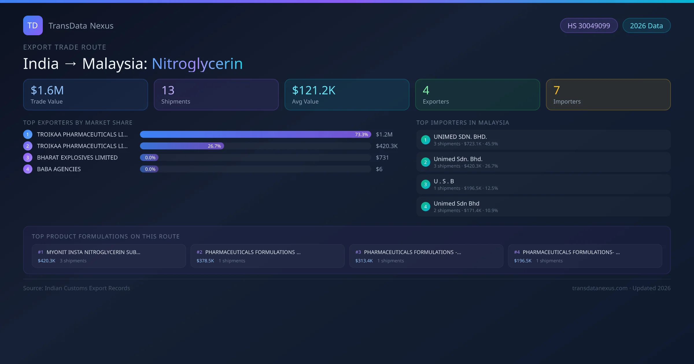 The India to Malaysia Nitroglycerin corridor is one of India's established pharmaceutical export routes, with 13 shipments documented worth a combined $1.6M USD. The route is dominated by TROIKAA PHARMACEUTICALS LIMITED, which alone accounts for roughly 73% of all export value, reflecting the consolidated nature of India's nitroglycerin manufacturing sector.