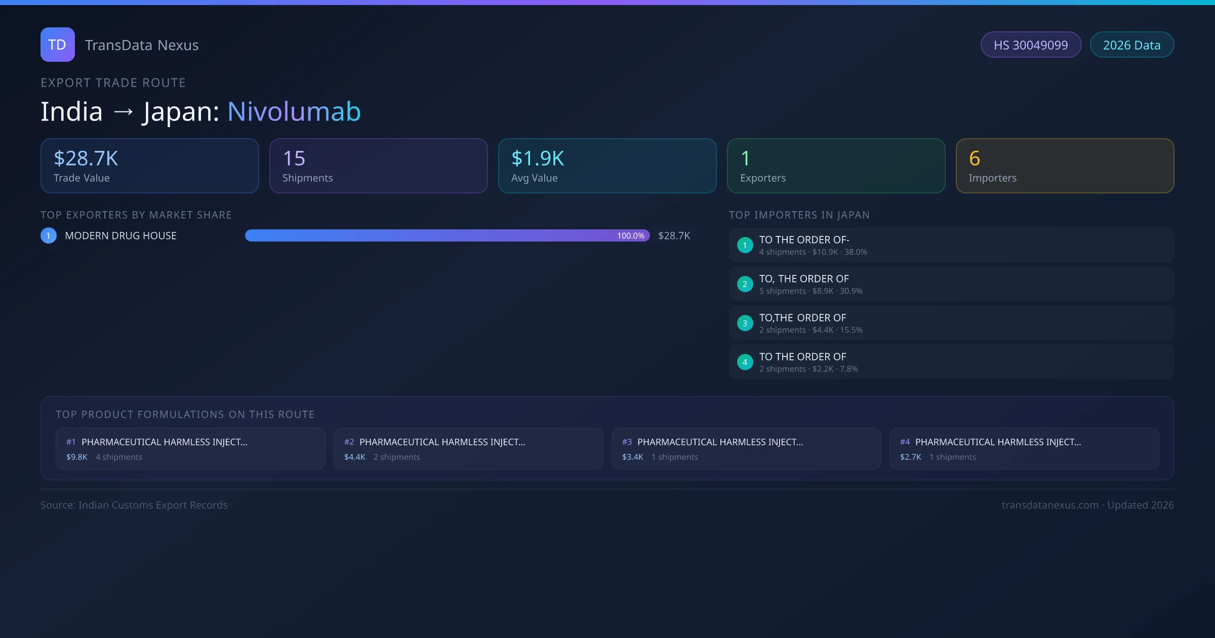 India has recorded 15 verified shipments of Nivolumab exported to Japan, representing a combined trade value of $28.7K USD. This corridor is served by 1 active Indian exporters, with an average shipment value of $1.9K USD. The leading Indian exporter is MODERN DRUG HOUSE, which accounts for 100% of total export value with 15 shipments worth $28.7K USD. On the buying side, TO THE ORDER OF- is the largest importer in Japan with $10.9K USD in purchases. All data sourced from Indian Customs (DGFT) shipping bill records. Values reported in FOB USD.