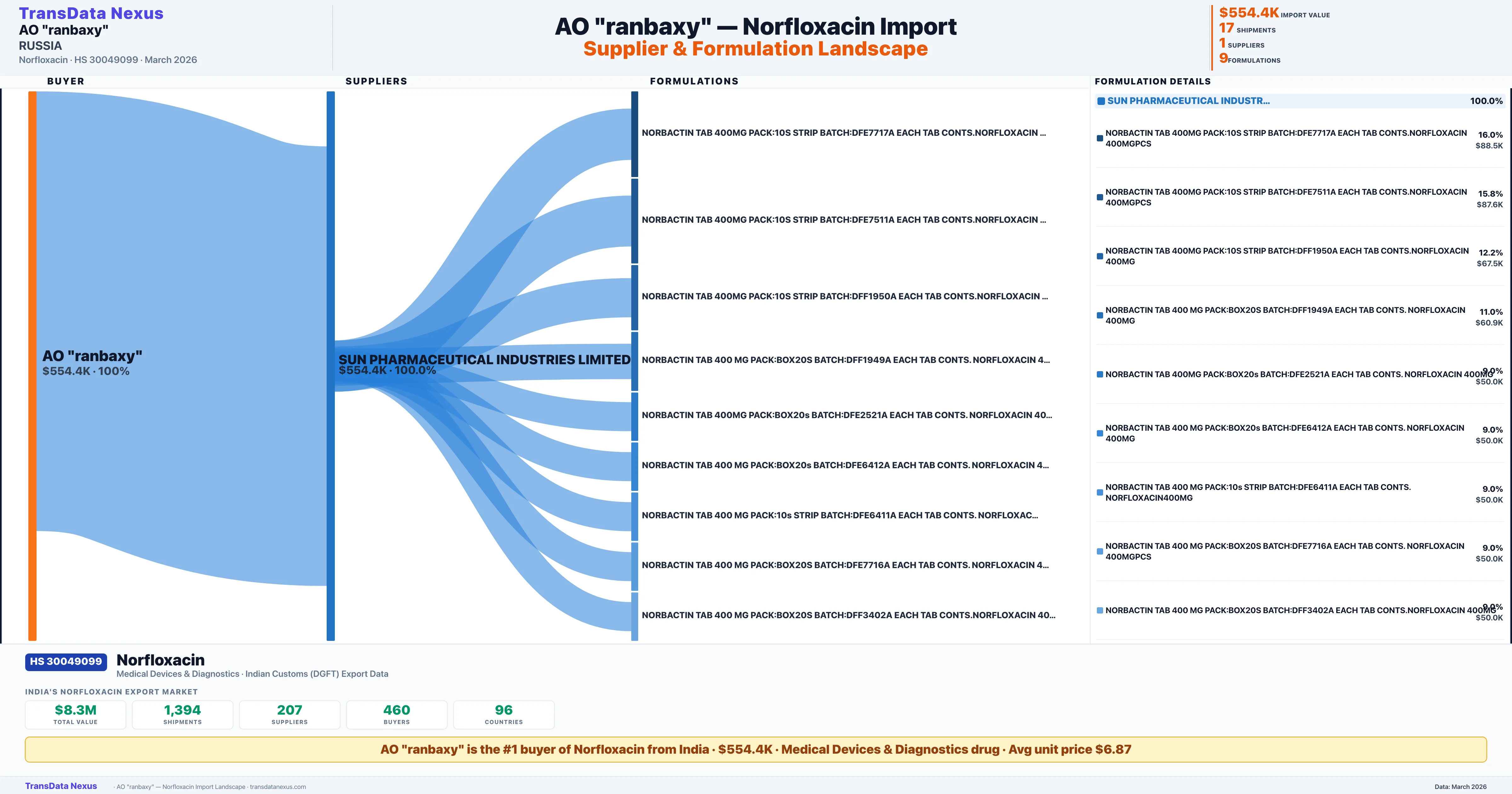AO RANBAXY sources Norfloxacin from 1 verified Indian supplier: SUN PHARMACEUTICAL INDUSTRIES LIMITED ($554.4K, 100.0%). This is based on 17 customs records.