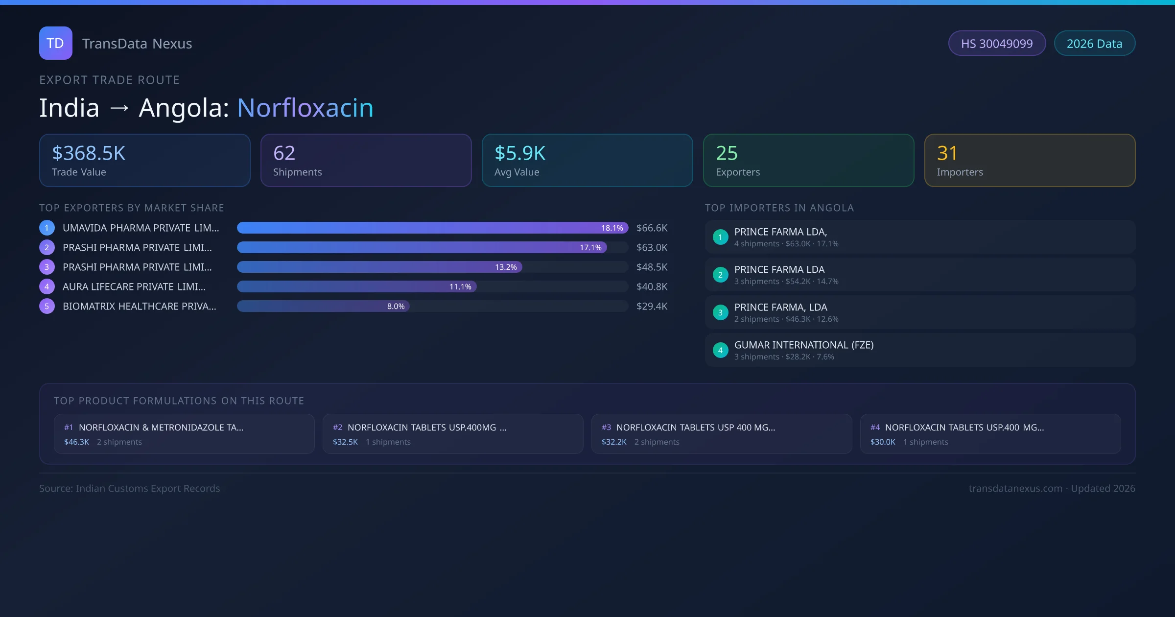 India has recorded 62 verified shipments of Norfloxacin exported to Angola, representing a combined trade value of $368.5K USD. This corridor is served by 25 active Indian exporters, with an average shipment value of $5.9K USD. The leading Indian exporter is UMAVIDA PHARMA PRIVATE LIMITED, which accounts for 18% of total export value with 5 shipments worth $66.6K USD. On the buying side, PRINCE FARMA LDA, is the largest importer in Angola with $63.0K USD in purchases. The top 3 suppliers — UMAVIDA PHARMA PRIVATE LIMITED, PRASHI PHARMA PRIVATE LIMITED , PRASHI PHARMA PRIVATE LIMITED — together control 48% of total trade value on this route. All data sourced from Indian Customs (DGFT) shipping bill records. Values reported in FOB USD.