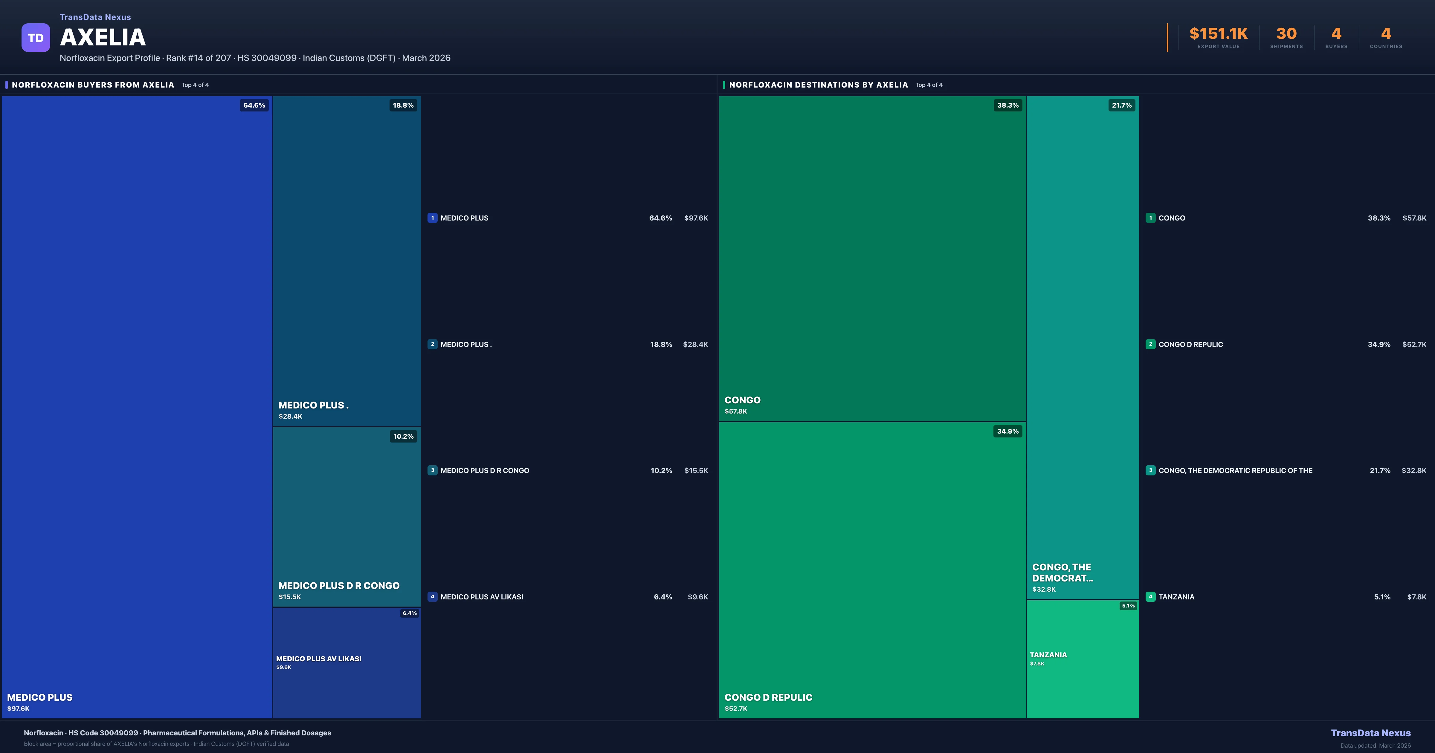 Axelia's average Norfloxacin shipment value is $5.0K per consignment, based on 30 shipments totaling $151.1K. The largest destination is CONGO (38.3% of Axelia's Norfloxacin exports).