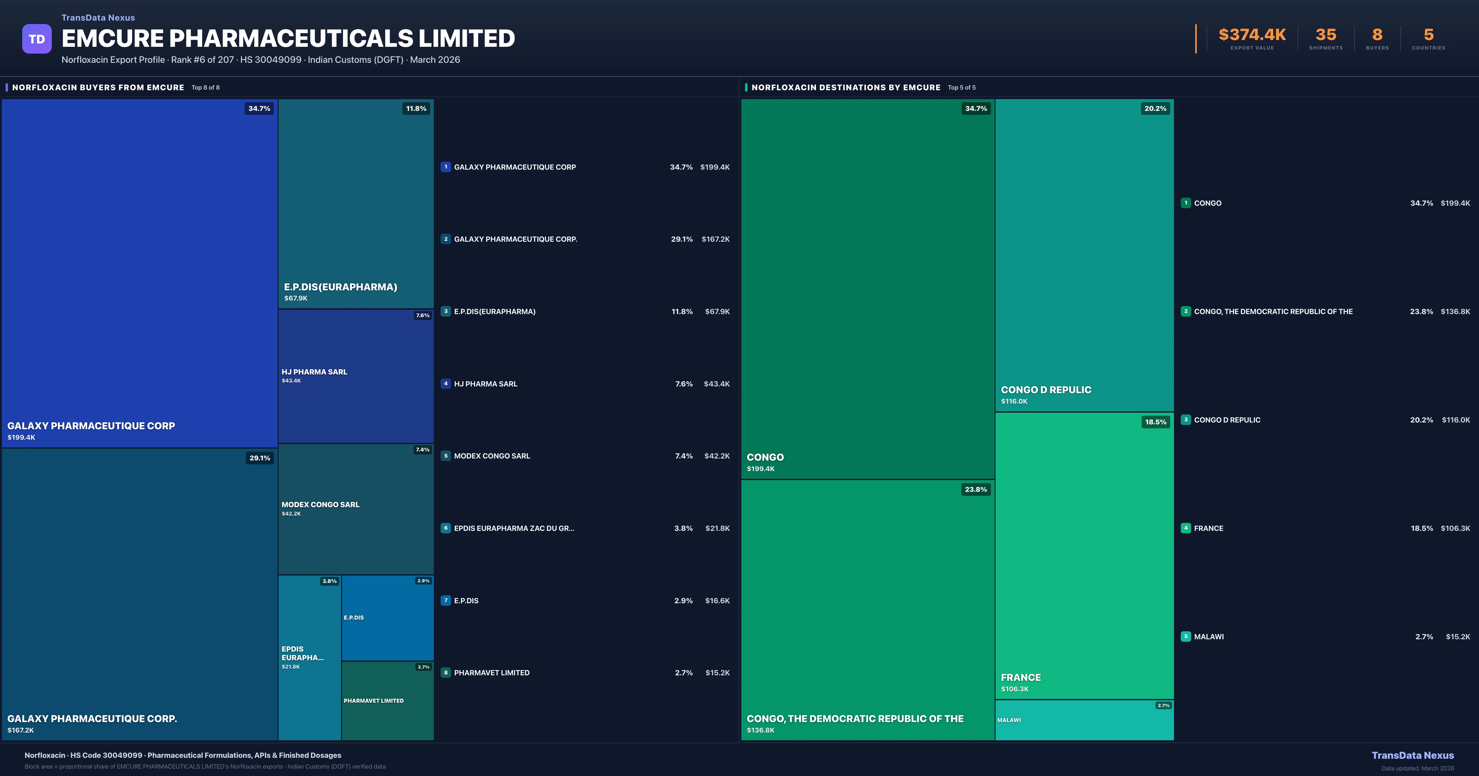 Emcure Pharmaceuticals Limited — Norfloxacin Export Profile: Buyers & Destinations