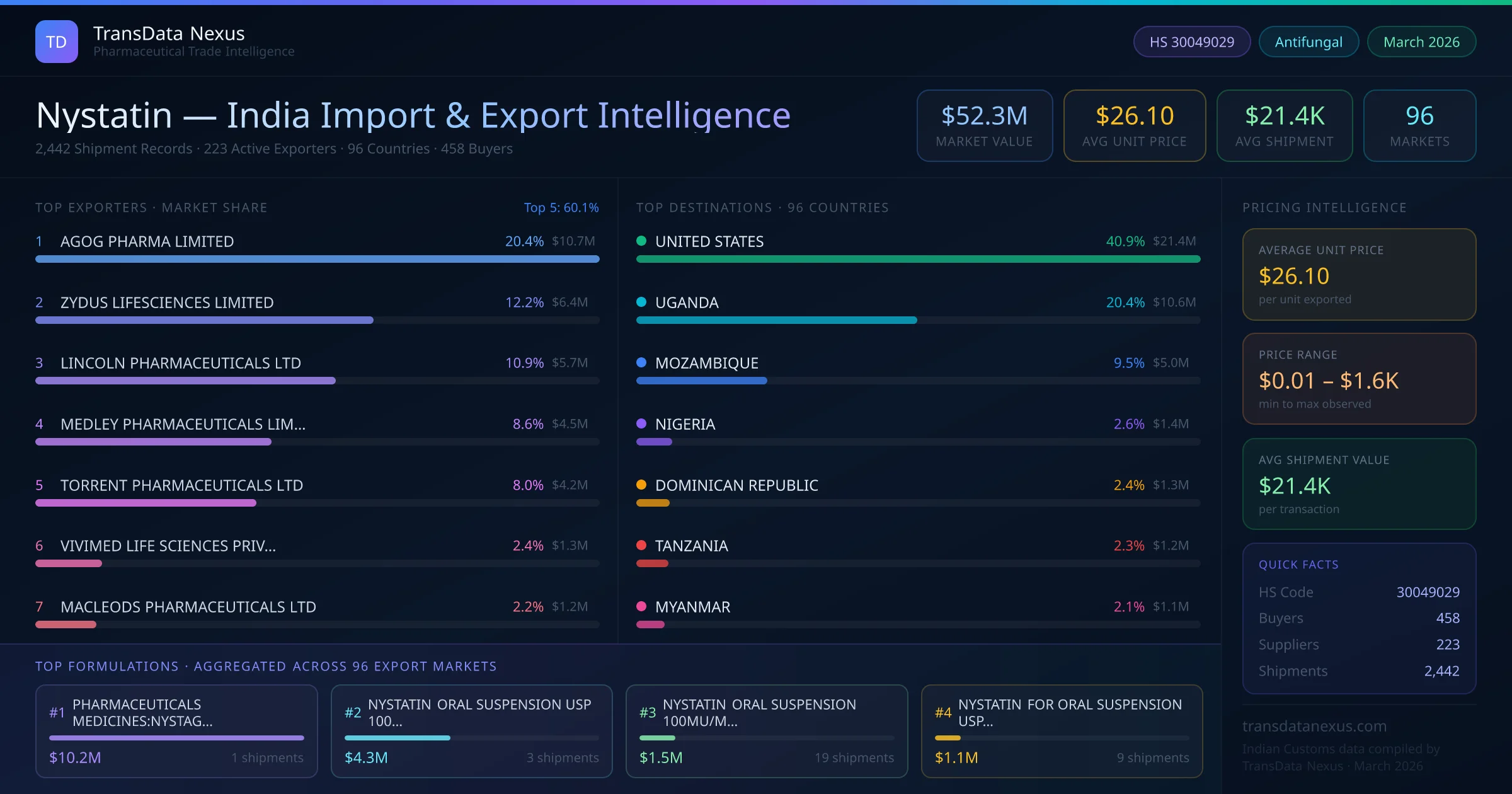Between 2022 and 2026, India exported $52.3M worth of nystatin across 2,442 verified shipments to 96 countries — covering 49% of world markets in the Antifungals segment. The largest destination is UNITED STATES (40.9%). AGOG PHARMA LIMITED leads with a 20.4% share. All figures are drawn from Indian Customs (DGFT) shipping bill records spanning four years of trade activity.