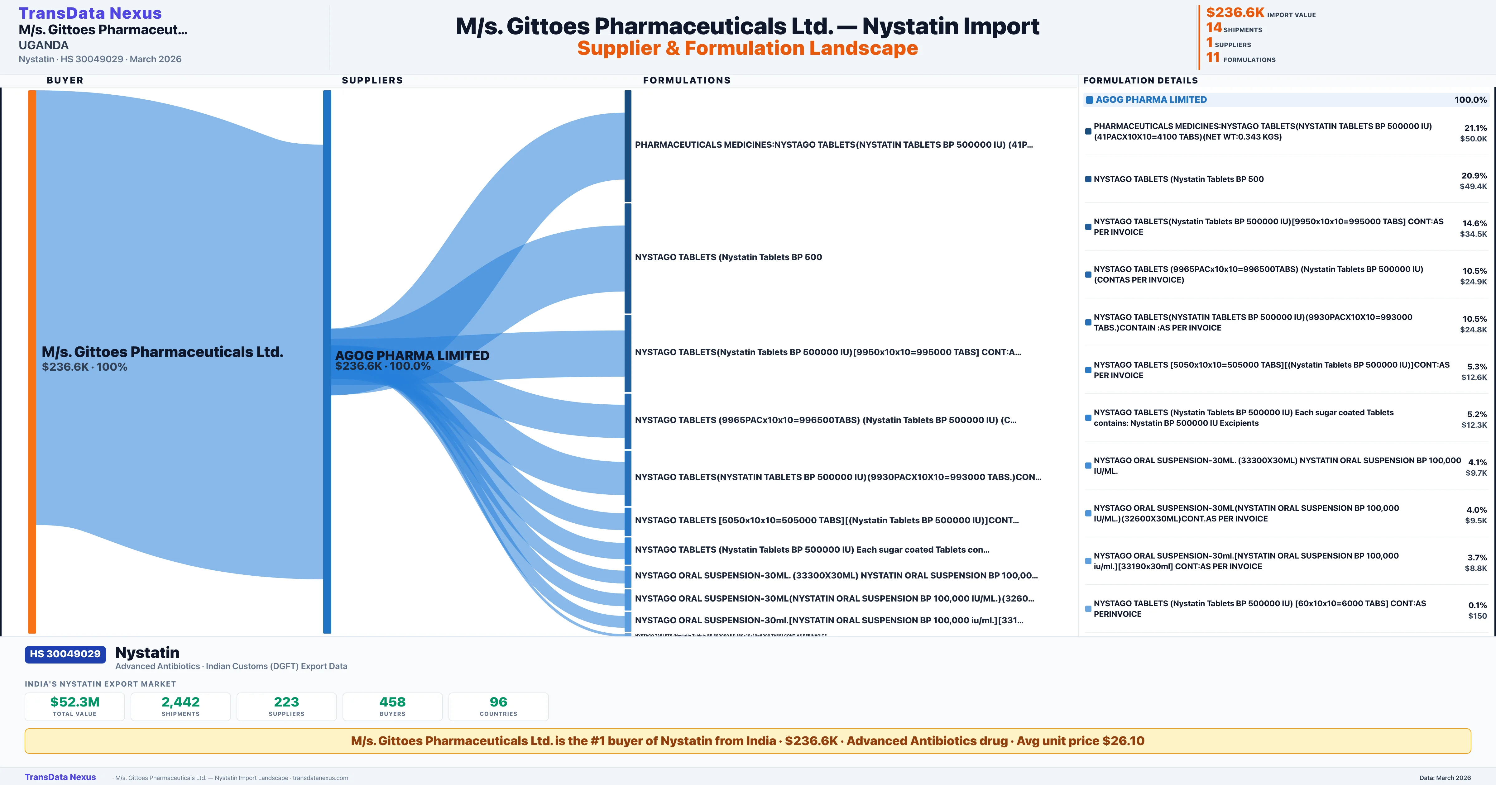M/S. GITTOES PHARMACEUTICALS LTD. sources Nystatin from 1 verified Indian supplier: AGOG PHARMA LIMITED ($236.6K, 100.0%). This is based on 14 customs records.