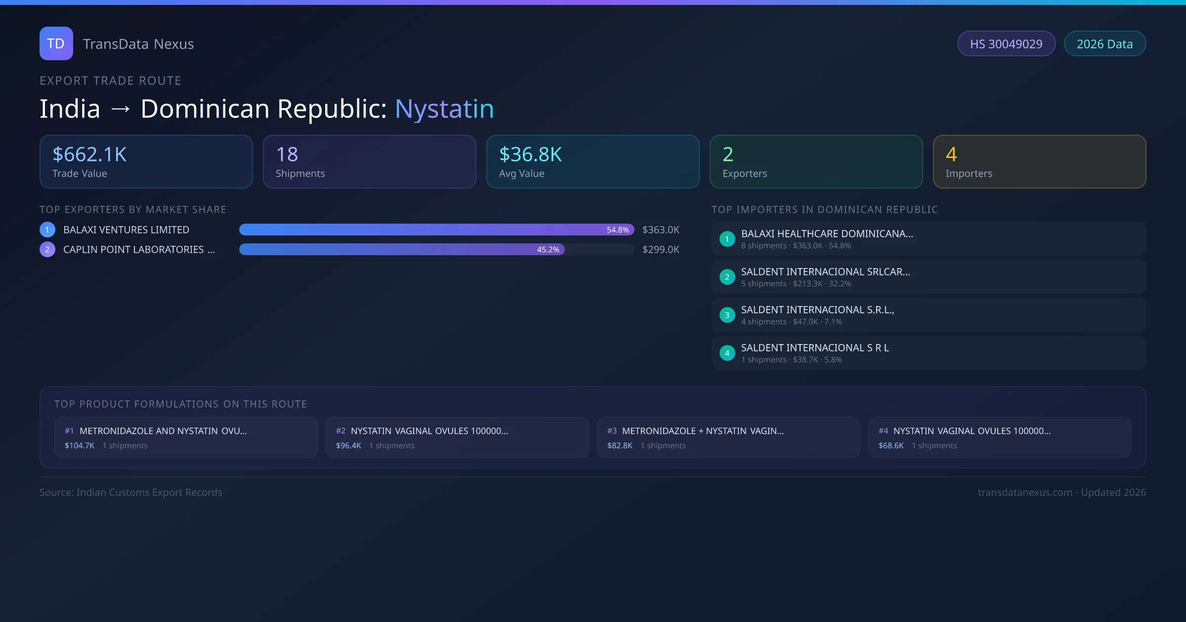 - 1.Route Identification: India to Dominican Republic export trade corridor identified from Indian Customs (DGFT) records for Nystatin.