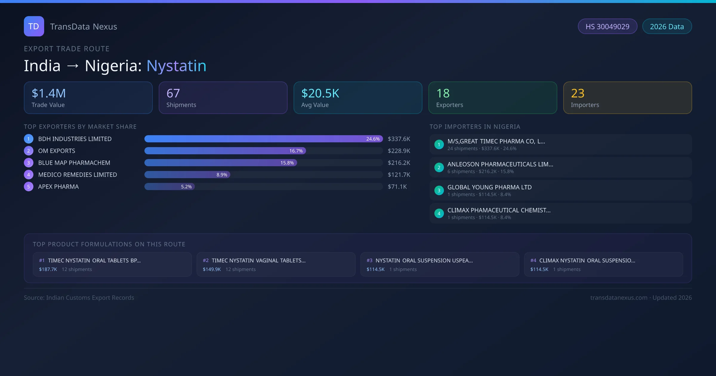 - 1.Route Identification: India to Nigeria export trade corridor identified from Indian Customs (DGFT) records for Nystatin.