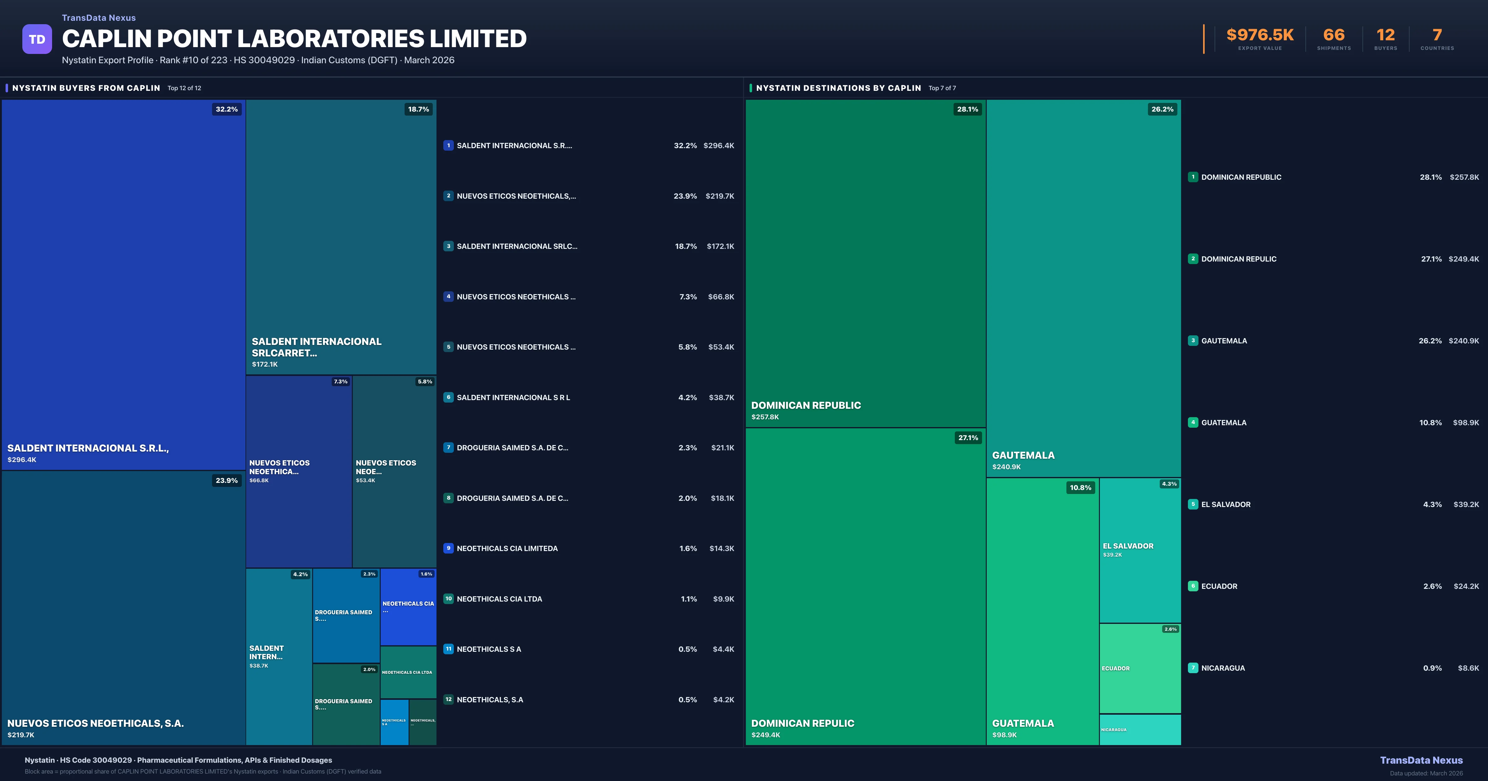 - 4.Verified Records: This page is backed by 66 individual customs records matching Caplin Point Laboratories Limited exporting Nystatin, covering 32 formulations to 7 countries via 12 buyers.