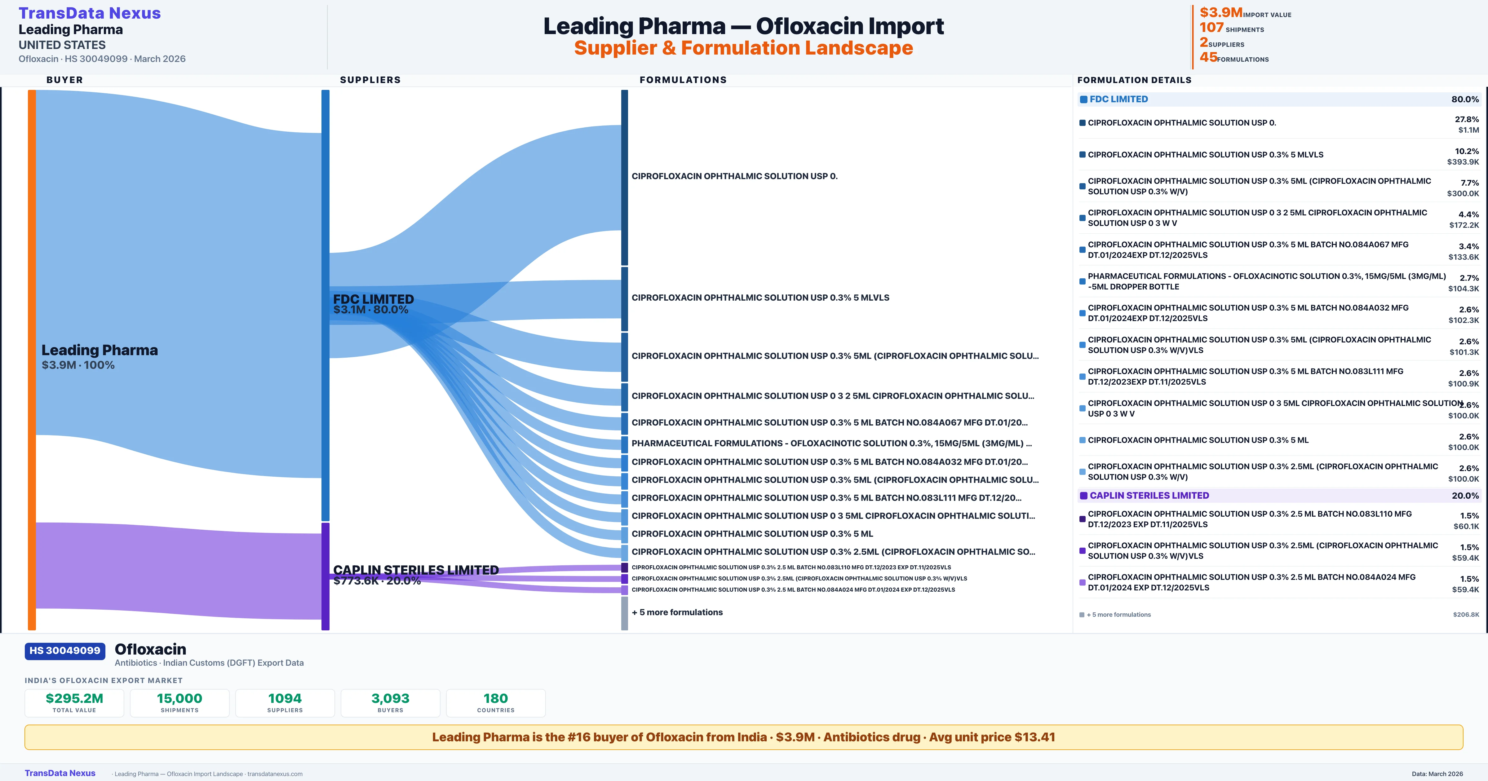 LEADING PHARMA sources Ofloxacin from 2 verified Indian suppliers: FDC LIMITED ($3.1M, 80.0%), CAPLIN STERILES LIMITED ($773.6K, 20.0%). This is based on 107 customs records.