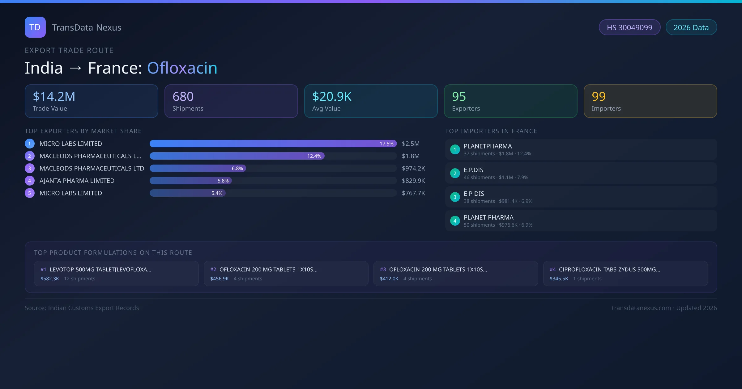 The India to France Ofloxacin corridor is one of India's established pharmaceutical export routes, with 680 shipments documented worth a combined $14.2M USD. The route is dominated by MICRO LABS LIMITED, which alone accounts for roughly 18% of all export value, reflecting the consolidated nature of India's ofloxacin manufacturing sector.