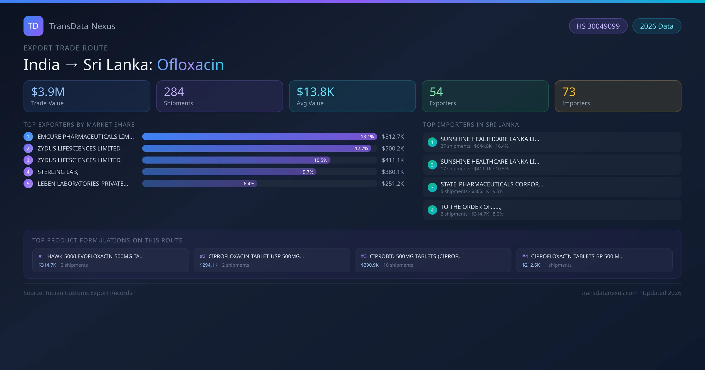 - 1.Route Identification: India to Sri Lanka export trade corridor identified from Indian Customs (DGFT) records for Ofloxacin.