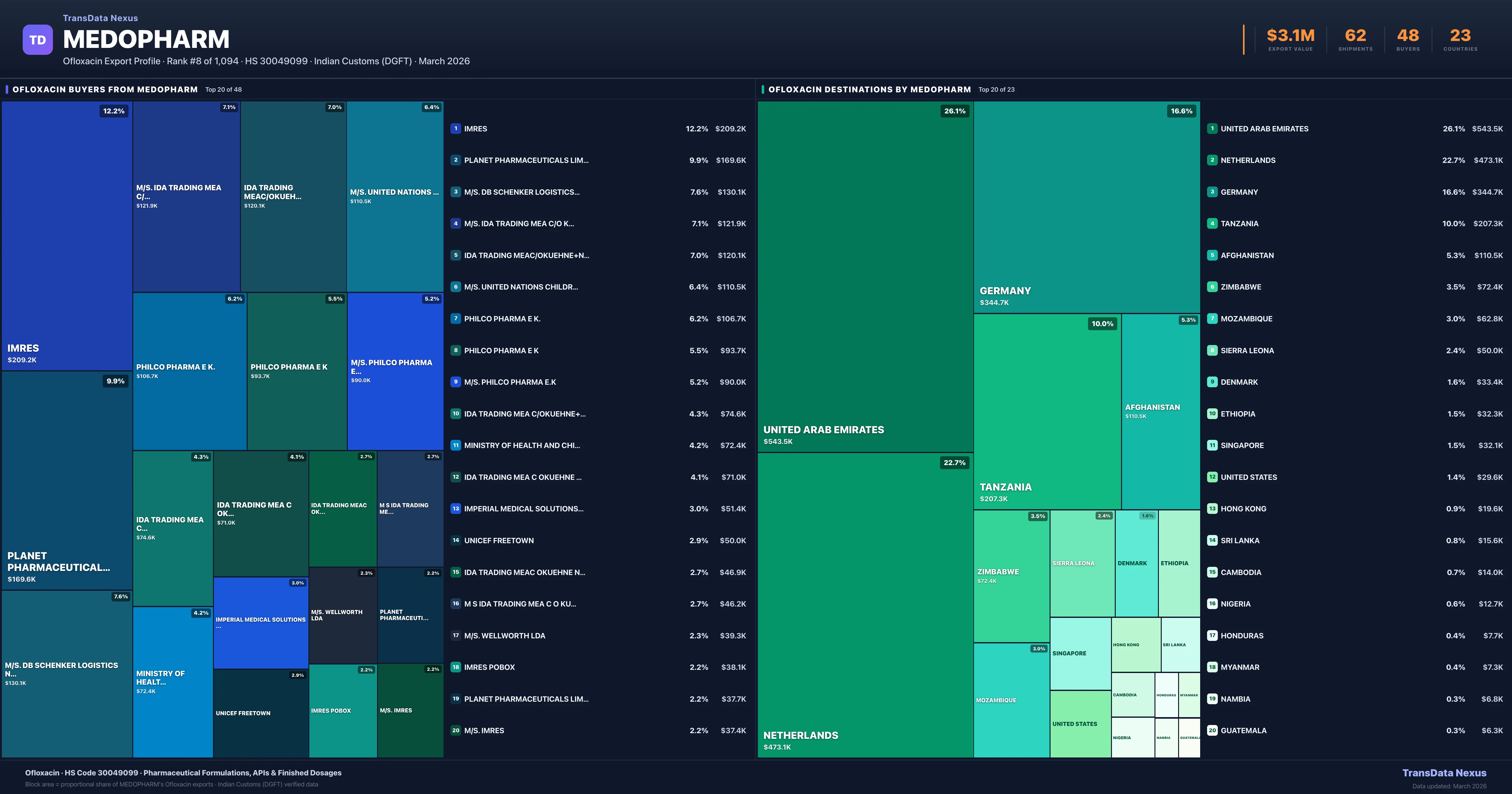 Medopharm supplies Ofloxacin to 48 buyers globally. The largest buyer is IMRES (NETHERLANDS), followed by PLANET PHARMACEUTICALS LIMITED (TANZANIA) and M/S. DB SCHENKER LOGISTICS NETHERLA (NETHERLANDS). These buyers represent pharmaceutical distributors, hospital groups, and government procurement agencies in their respective markets.