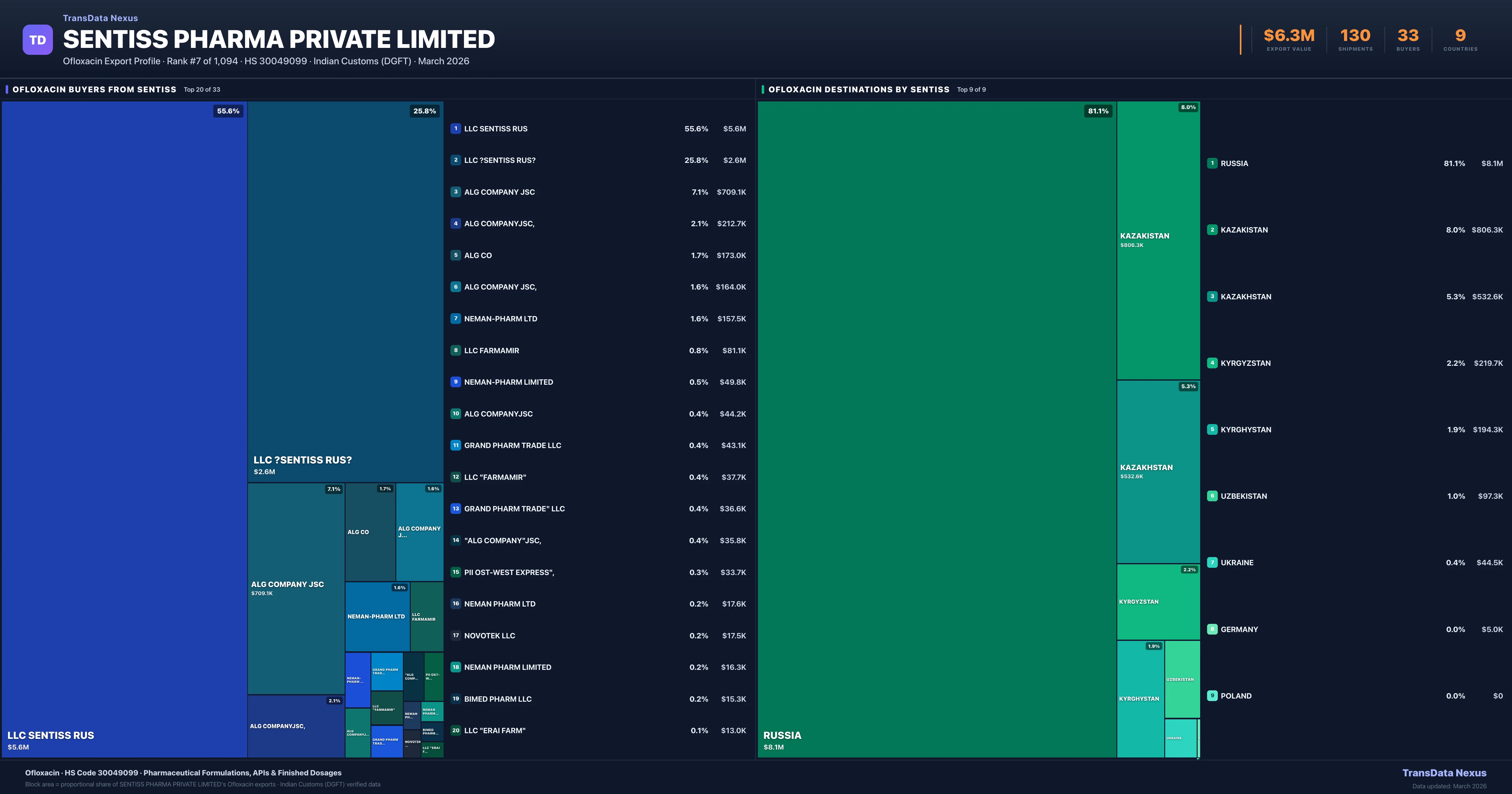 Sentiss Pharma Private Limited supplies Ofloxacin to 33 buyers globally. The largest buyer is LLC SENTISS RUS (RUSSIA), followed by LLC ?SENTISS RUS? (RUSSIA) and ALG COMPANY JSC (KAZAKISTAN). These buyers represent pharmaceutical distributors, hospital groups, and government procurement agencies in their respective markets.
