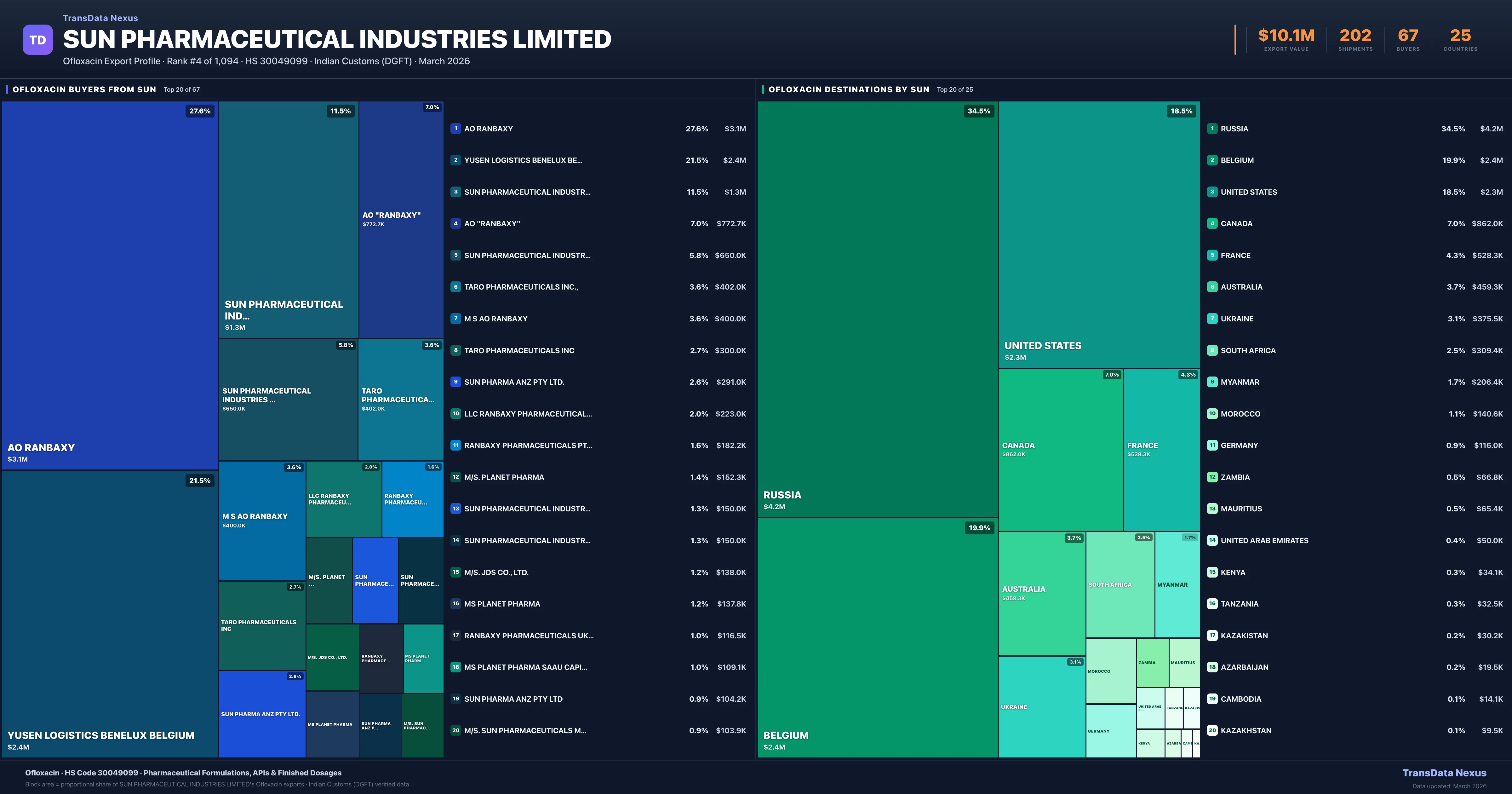 SUN Pharmaceutical Industries Limited — Ofloxacin Export Profile: Buyers & Destinations