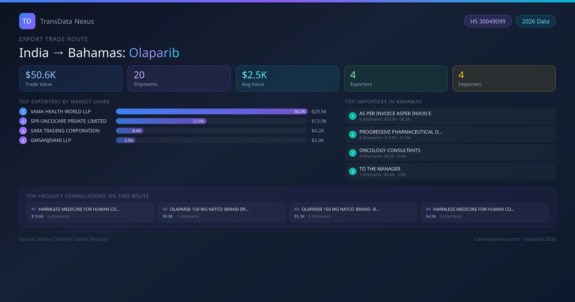 - 1.Route Identification: India to Bahamas export trade corridor identified from Indian Customs (DGFT) records for Olaparib.