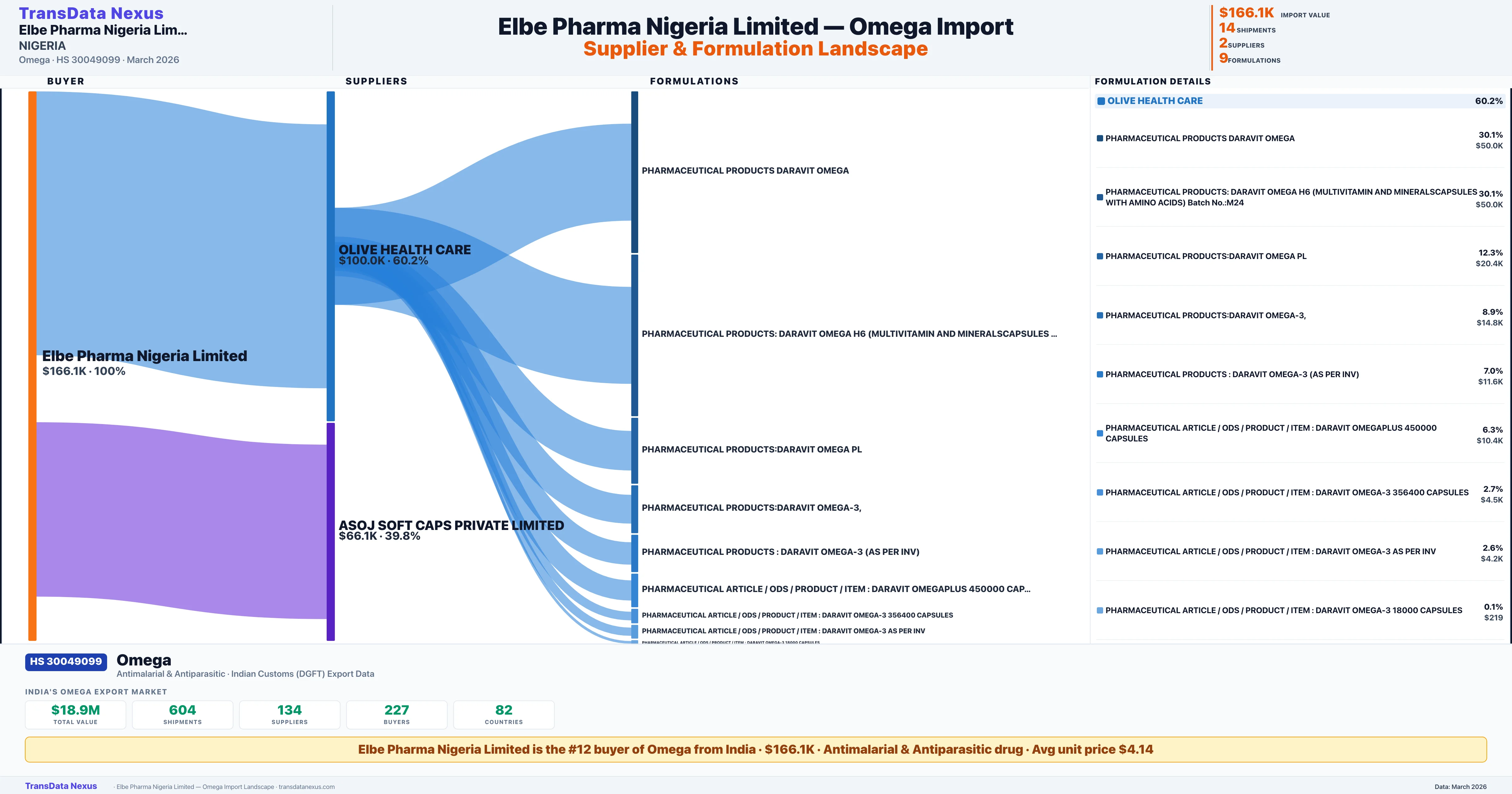 ELBE PHARMA NIGERIA LIMITED sources Omega from 2 verified Indian suppliers: OLIVE HEALTH CARE ($100.0K, 60.2%), ASOJ SOFT CAPS PRIVATE LIMITED ($66.1K, 39.8%). This is based on 14 customs records.