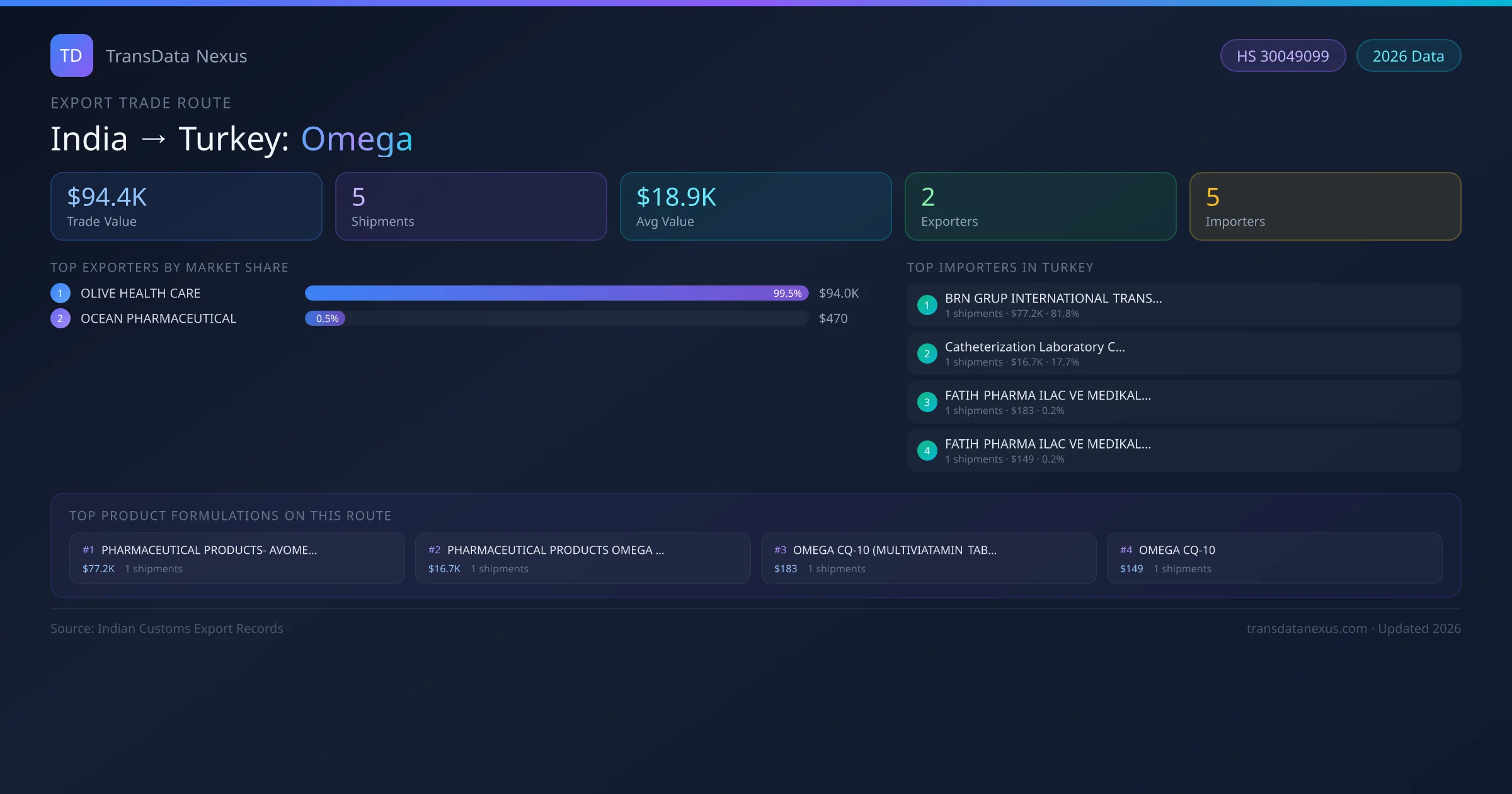 The India to Turkey Omega corridor is one of India's established pharmaceutical export routes, with 5 shipments documented worth a combined $94.4K USD. The route is dominated by OLIVE HEALTH CARE, which alone accounts for roughly 100% of all export value, reflecting the consolidated nature of India's omega manufacturing sector.