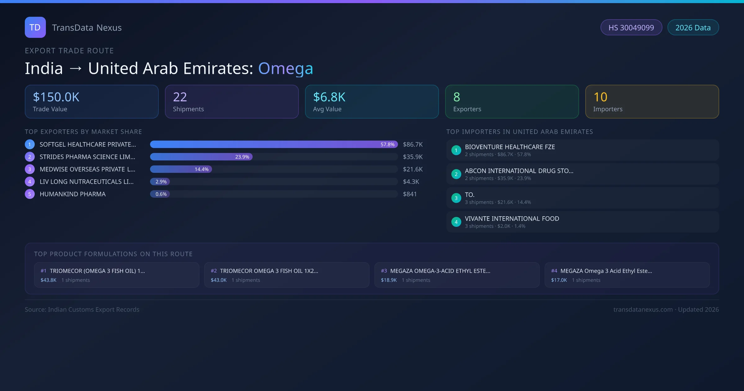 India has recorded 22 verified shipments of Omega exported to United Arab Emirates, representing a combined trade value of $150.0K USD. This corridor is served by 8 active Indian exporters, with an average shipment value of $6.8K USD. The leading Indian exporter is SOFTGEL HEALTHCARE PRIVATE LIMITED, which accounts for 58% of total export value with 2 shipments worth $86.7K USD. On the buying side, BIOVENTURE HEALTHCARE FZE is the largest importer in United Arab Emirates with $86.7K USD in purchases. The top 3 suppliers — SOFTGEL HEALTHCARE PRIVATE LIMITED, STRIDES PHARMA SCIENCE LIMITED, MEDWISE OVERSEAS PRIVATE LIMITED — together control 96% of total trade value on this route. All data sourced from Indian Customs (DGFT) shipping bill records. Values reported in FOB USD.