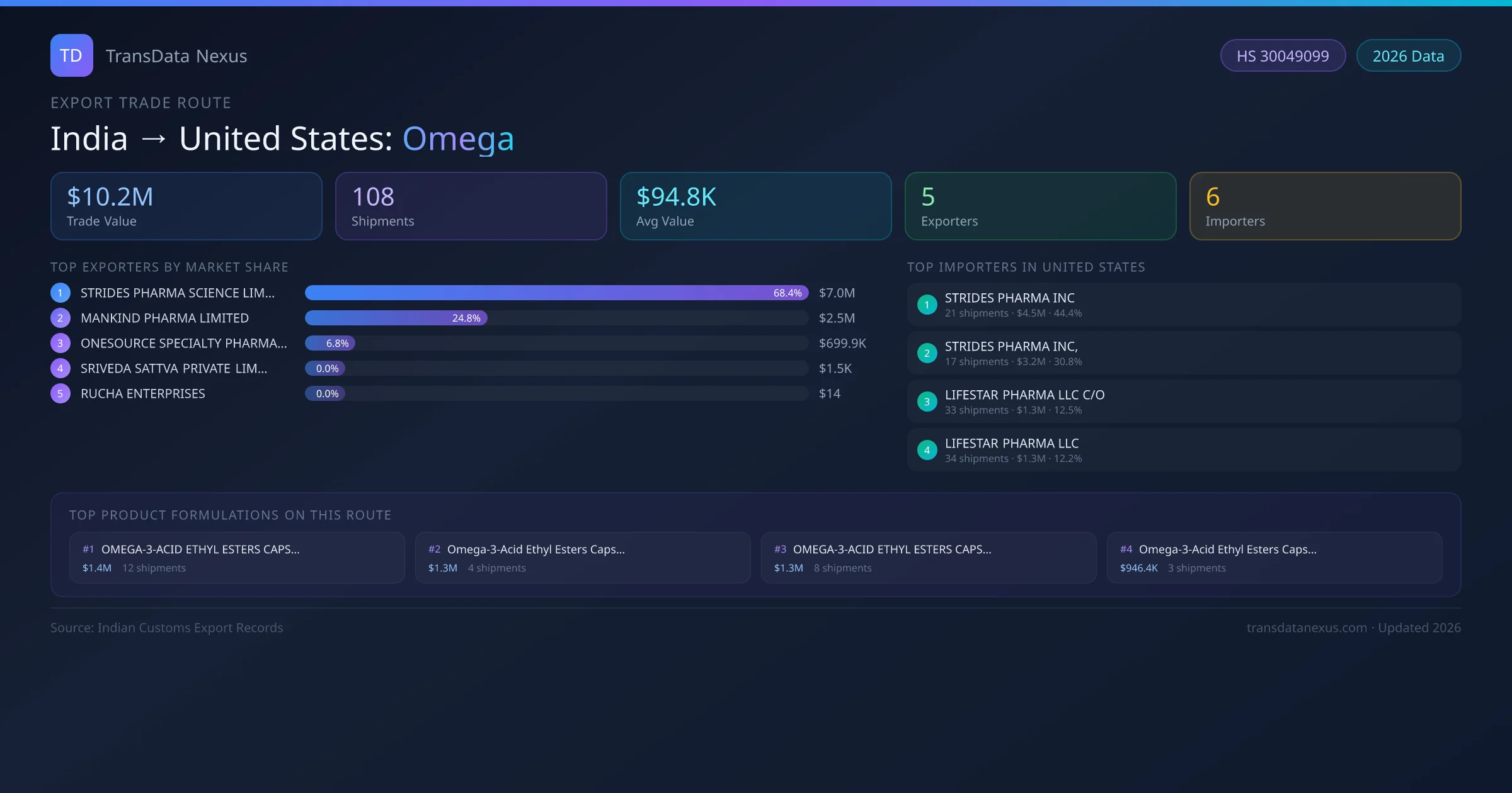 The India to United States Omega corridor is one of India's established pharmaceutical export routes, with 108 shipments documented worth a combined $10.2M USD. The route is dominated by STRIDES PHARMA SCIENCE LIMITED, which alone accounts for roughly 68% of all export value, reflecting the consolidated nature of India's omega manufacturing sector.