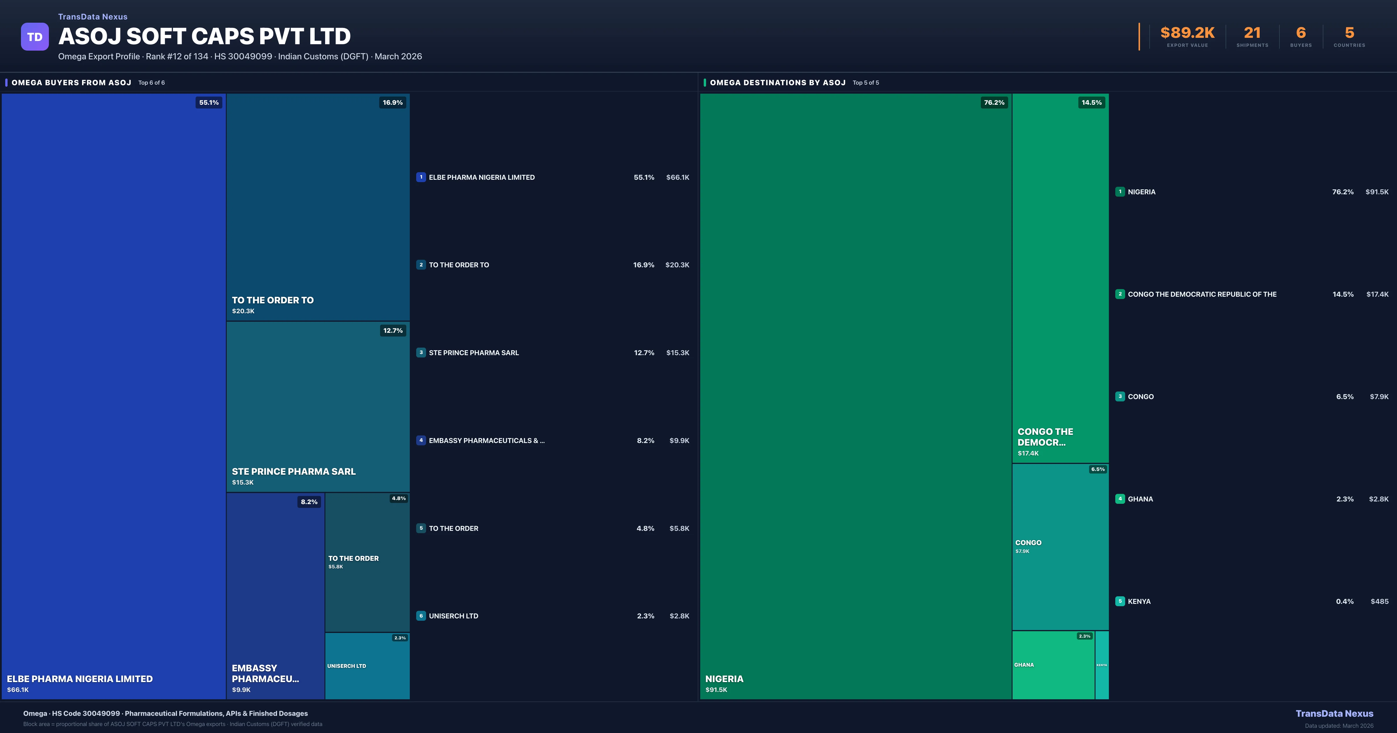 - 4.Verified Records: This page is backed by 27 individual customs records matching Asoj Soft Caps Pvt Ltd exporting Omega, covering 20 formulations to 5 countries via 6 buyers.