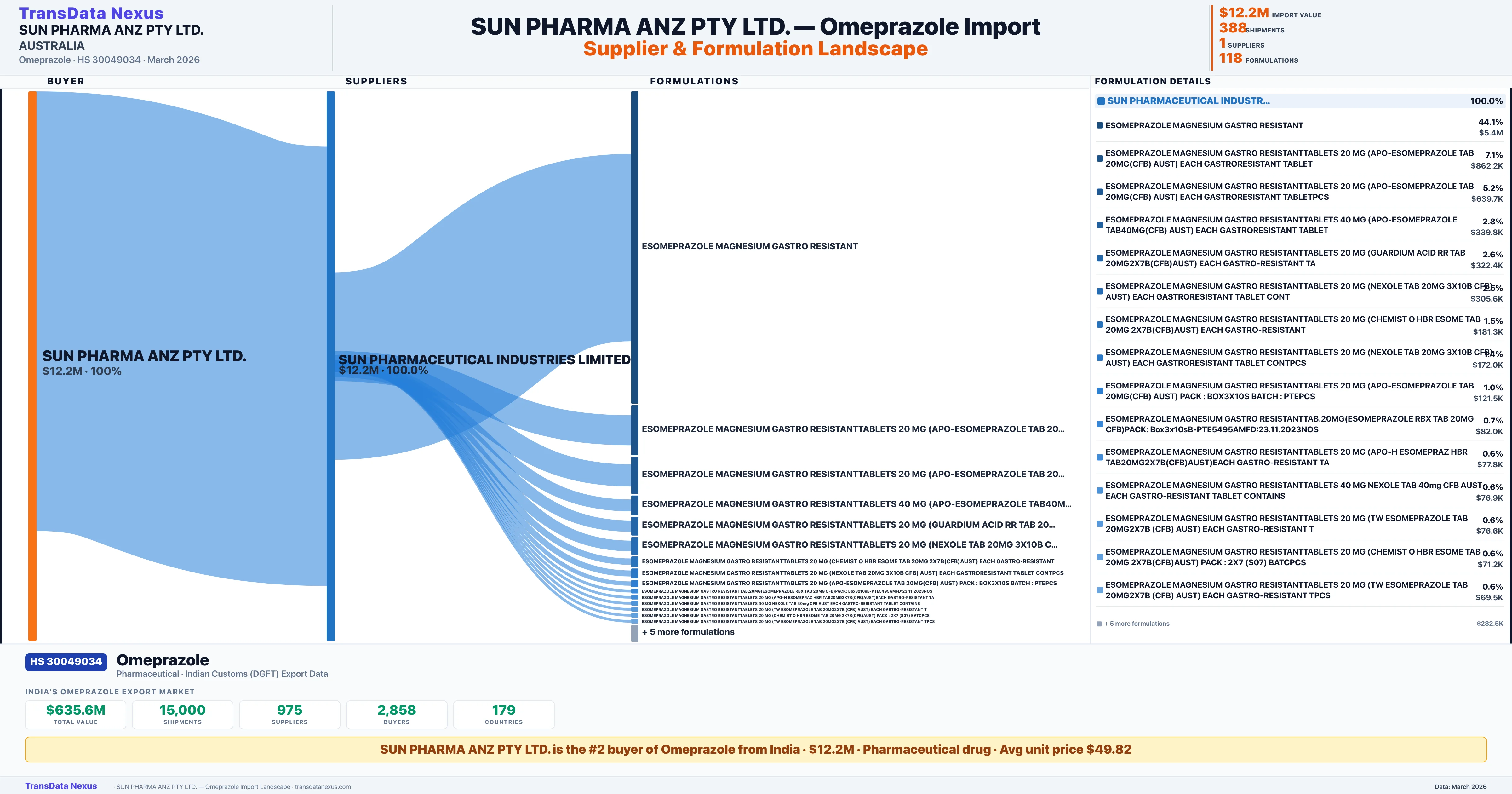 SUN PHARMA ANZ PTY LTD. sources Omeprazole from 1 verified Indian supplier based on 388 customs records. The primary supplier is SUN PHARMACEUTICAL INDUSTRIES LIMITED accounting for 100.0% of imports.