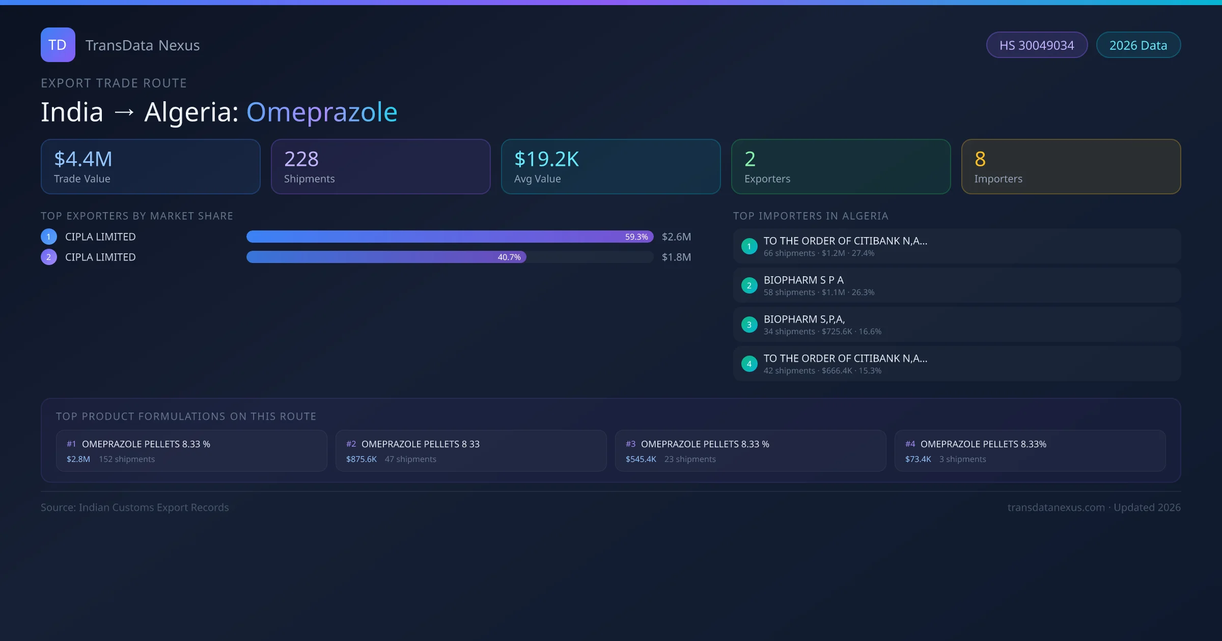 India has recorded 228 verified shipments of Omeprazole exported to Algeria, representing a combined trade value of $4.4M USD. This corridor is served by 2 active Indian exporters, with an average shipment value of $19.2K USD. The leading Indian exporter is CIPLA LIMITED , which accounts for 59% of total export value with 142 shipments worth $2.6M USD. On the buying side, TO THE ORDER OF CITIBANK N,A,ALGERI is the largest importer in Algeria with $1.2M USD in purchases. All data sourced from Indian Customs (DGFT) shipping bill records. Values reported in FOB USD.