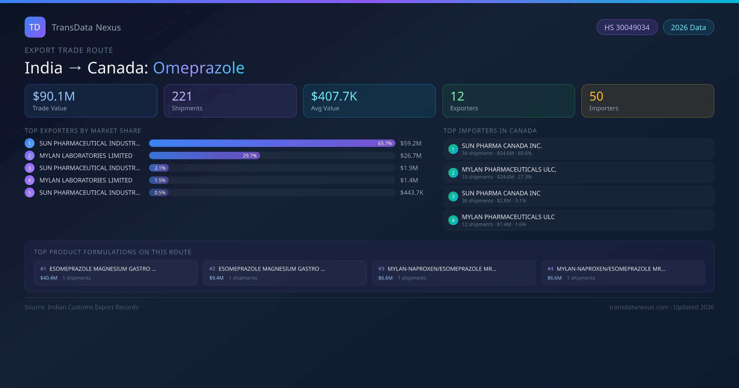 The India to Canada Omeprazole corridor is one of India's established pharmaceutical export routes, with 221 shipments documented worth a combined $90.1M USD. The route is dominated by SUN PHARMACEUTICAL INDUSTRIES LIMITED, which alone accounts for roughly 66% of all export value, reflecting the consolidated nature of India's omeprazole manufacturing sector.