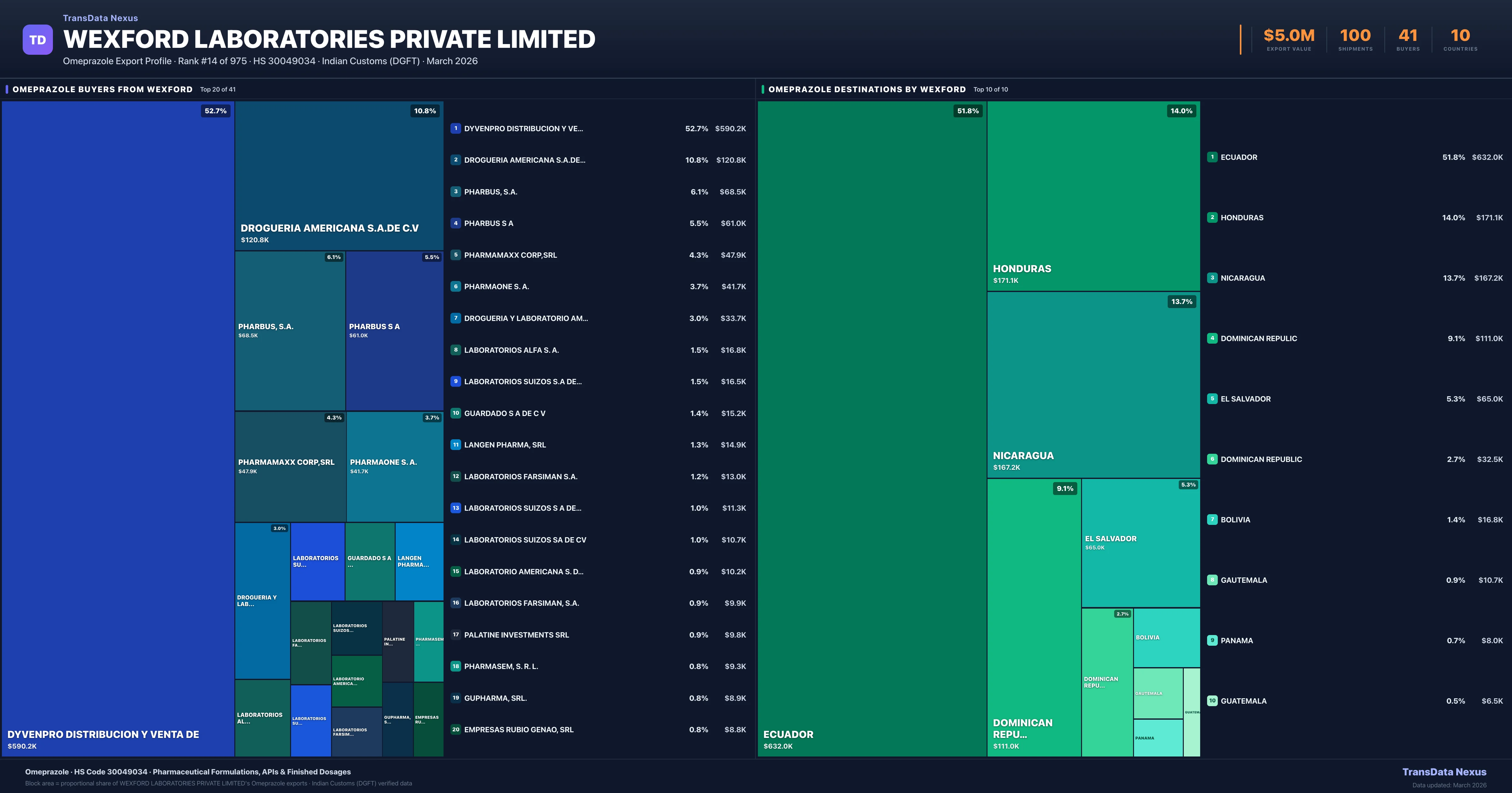 Wexford Laboratories Private Limited supplies Omeprazole to 41 buyers globally. The largest buyer is DYVENPRO DISTRIBUCION Y VENTA DE (ECUADOR), followed by DROGUERIA AMERICANA S.A.DE C.V (HONDURAS) and PHARBUS, S.A. (NICARAGUA). These buyers represent pharmaceutical distributors, hospital groups, and government procurement agencies in their respective markets.
