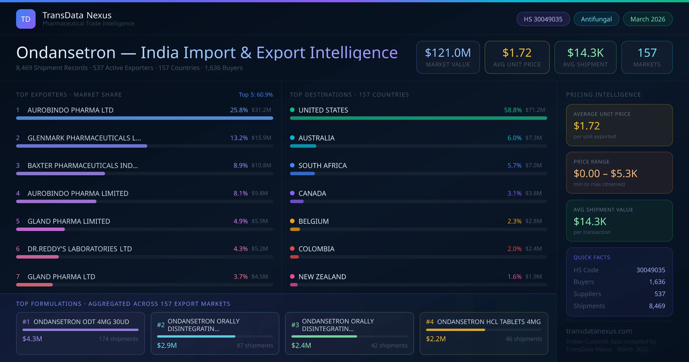 Between 2022 and 2026, India exported $121.0M worth of ondansetron across 8,469 verified shipments to 157 countries — covering 81% of world markets in the Gastrointestinal segment. The largest destination is UNITED STATES (58.8%). AUROBINDO PHARMA LTD leads with a 25.8% share. All figures are drawn from Indian Customs (DGFT) shipping bill records spanning four years of trade activity.