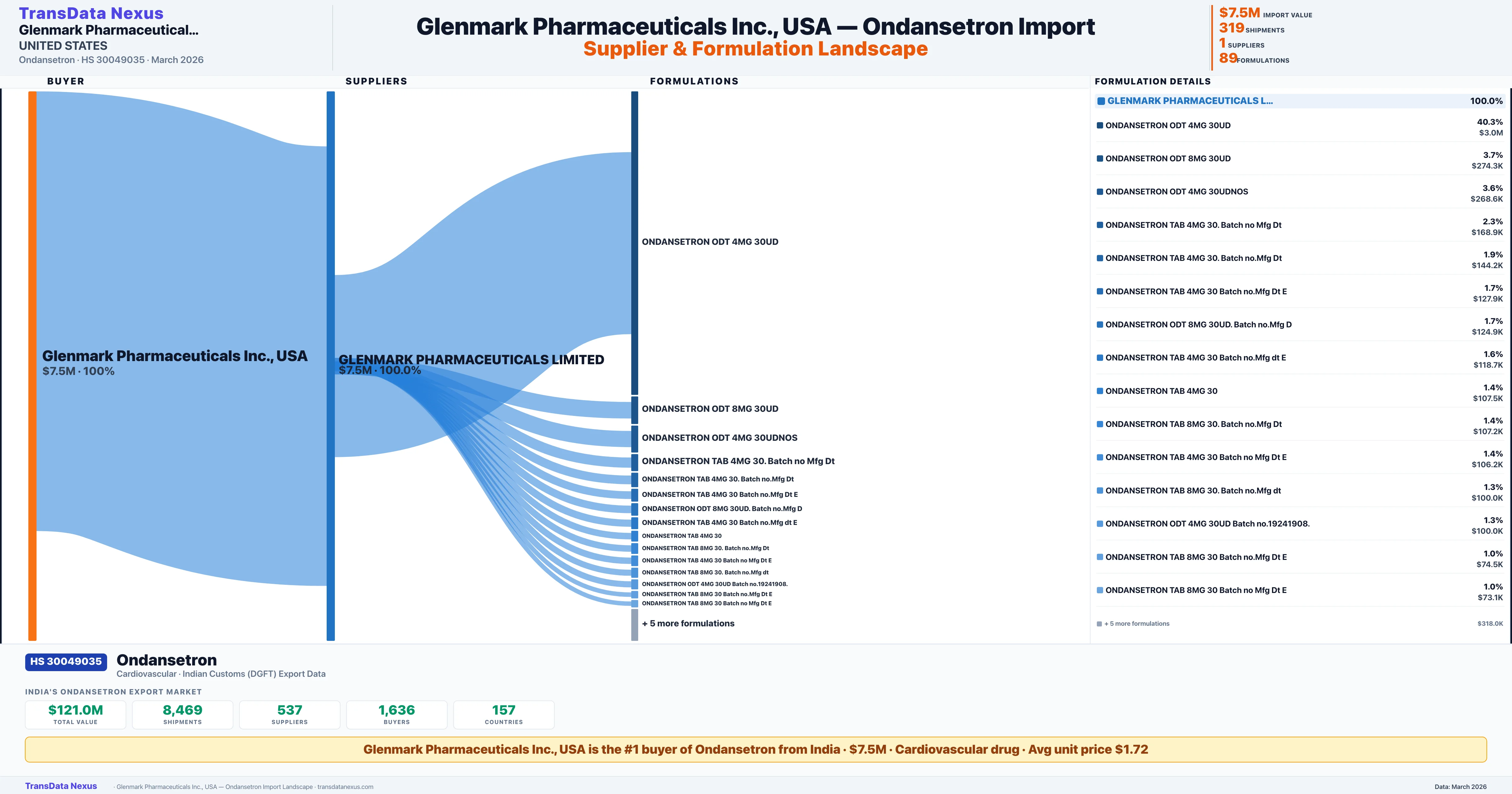 GLENMARK PHARMACEUTICALS INC., USA sources Ondansetron from 1 verified Indian supplier: GLENMARK PHARMACEUTICALS LIMITED ($7.5M, 100.0%). This is based on 319 customs records.