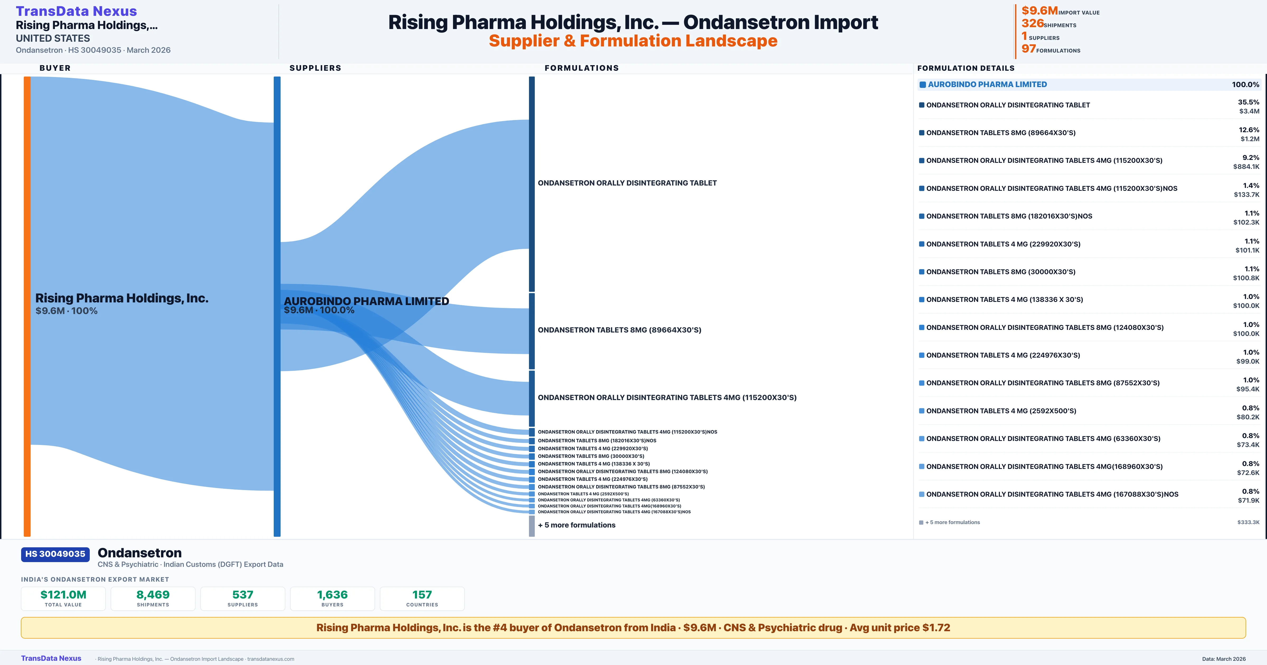 RISING PHARMA HOLDINGS, INC. ,. sources Ondansetron from 1 verified Indian supplier based on 326 customs records. The primary supplier is AUROBINDO PHARMA LIMITED accounting for 100.0% of imports.