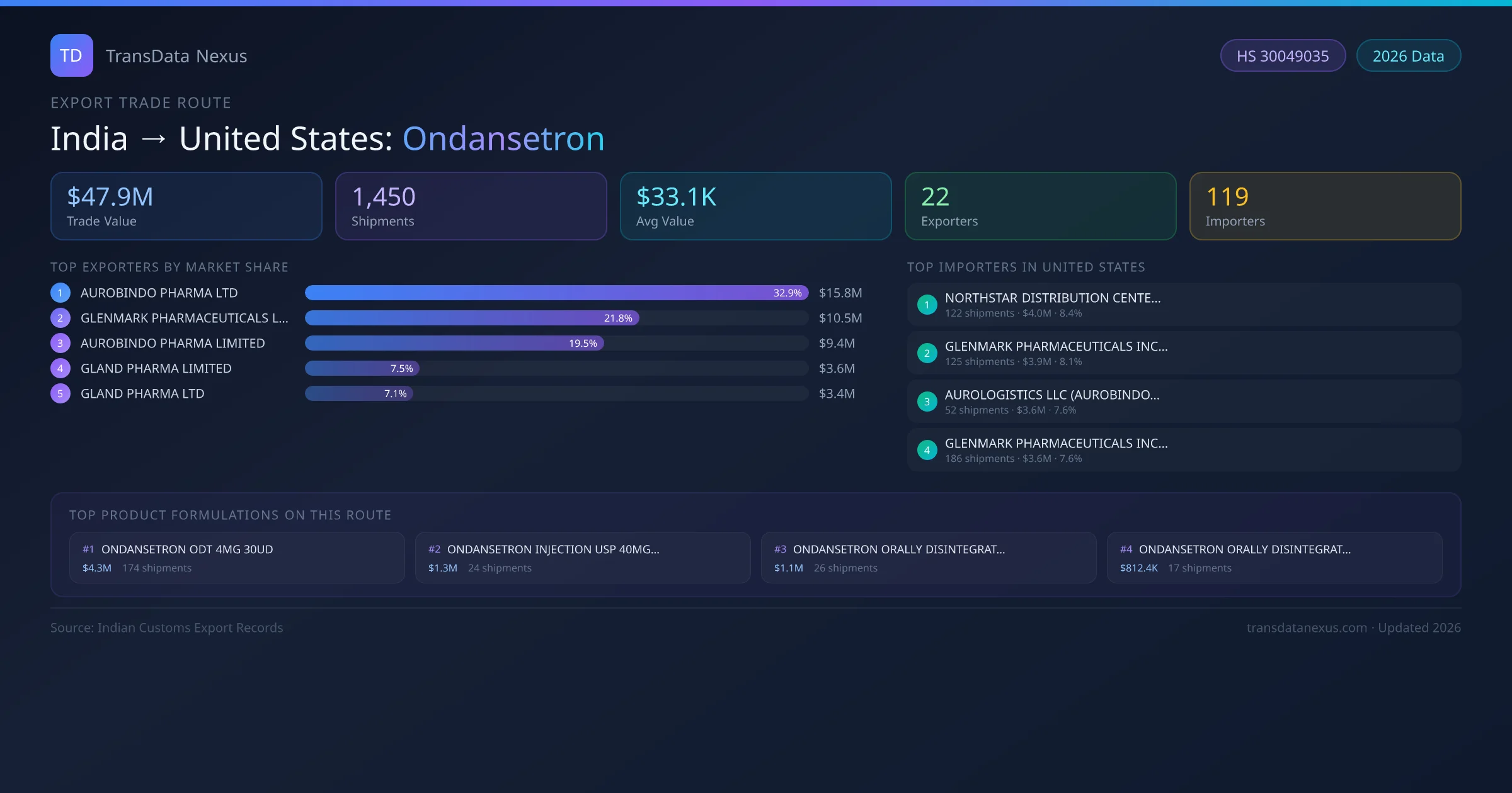 India exports Ondansetron to United States worth approximately $47.9M USD across 1,450 recorded shipments. The average value per shipment is $33.1K USD.