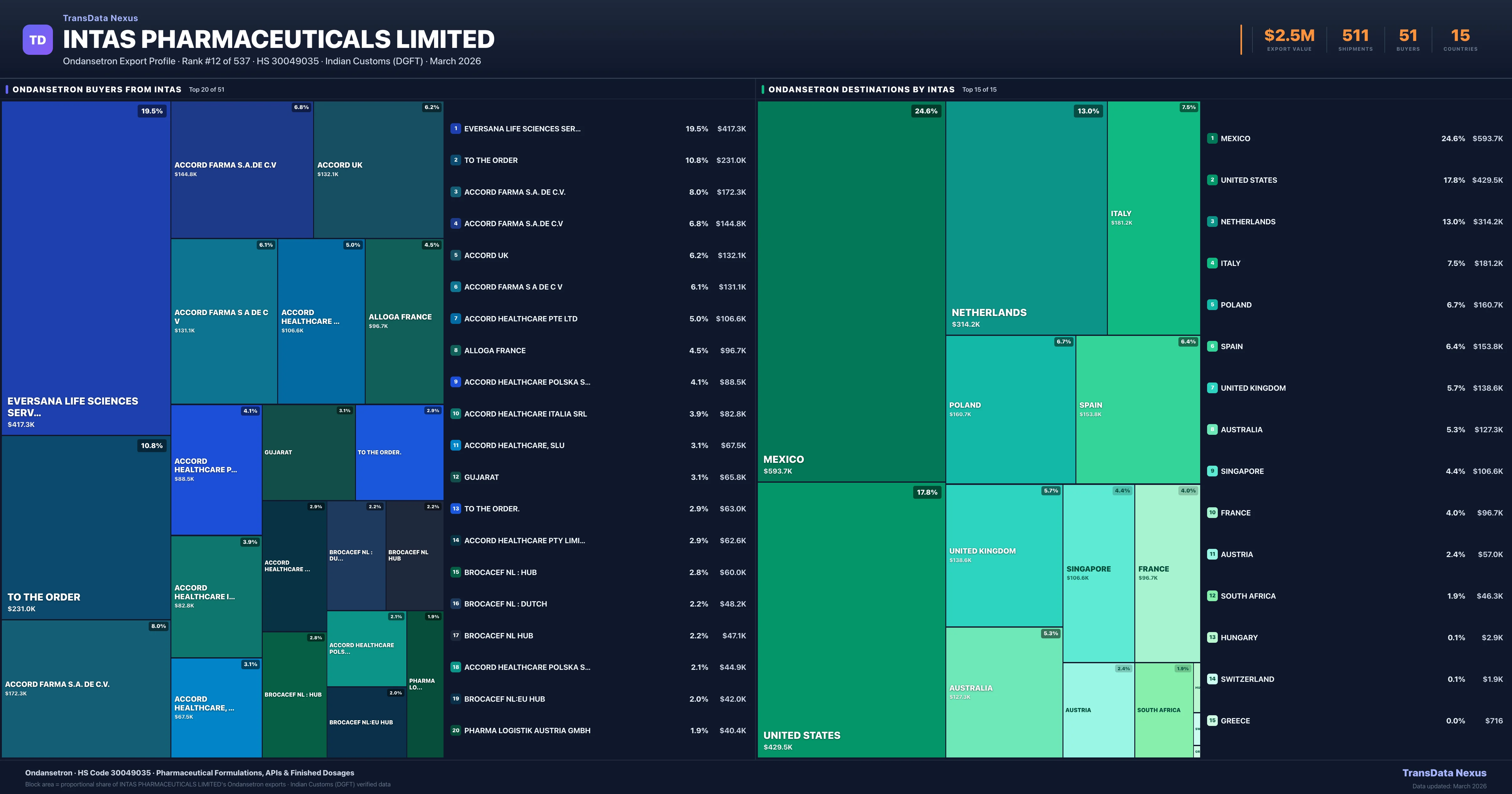 Intas Pharmaceuticals Limited supplies Ondansetron to 51 buyers globally. The largest buyer is EVERSANA LIFE SCIENCES SERVICES,LLC (UNITED STATES), followed by TO THE ORDER (UNITED KINGDOM) and ACCORD FARMA S.A. DE C.V. (MEXICO). These buyers represent pharmaceutical distributors, hospital groups, and government procurement agencies in their respective markets.