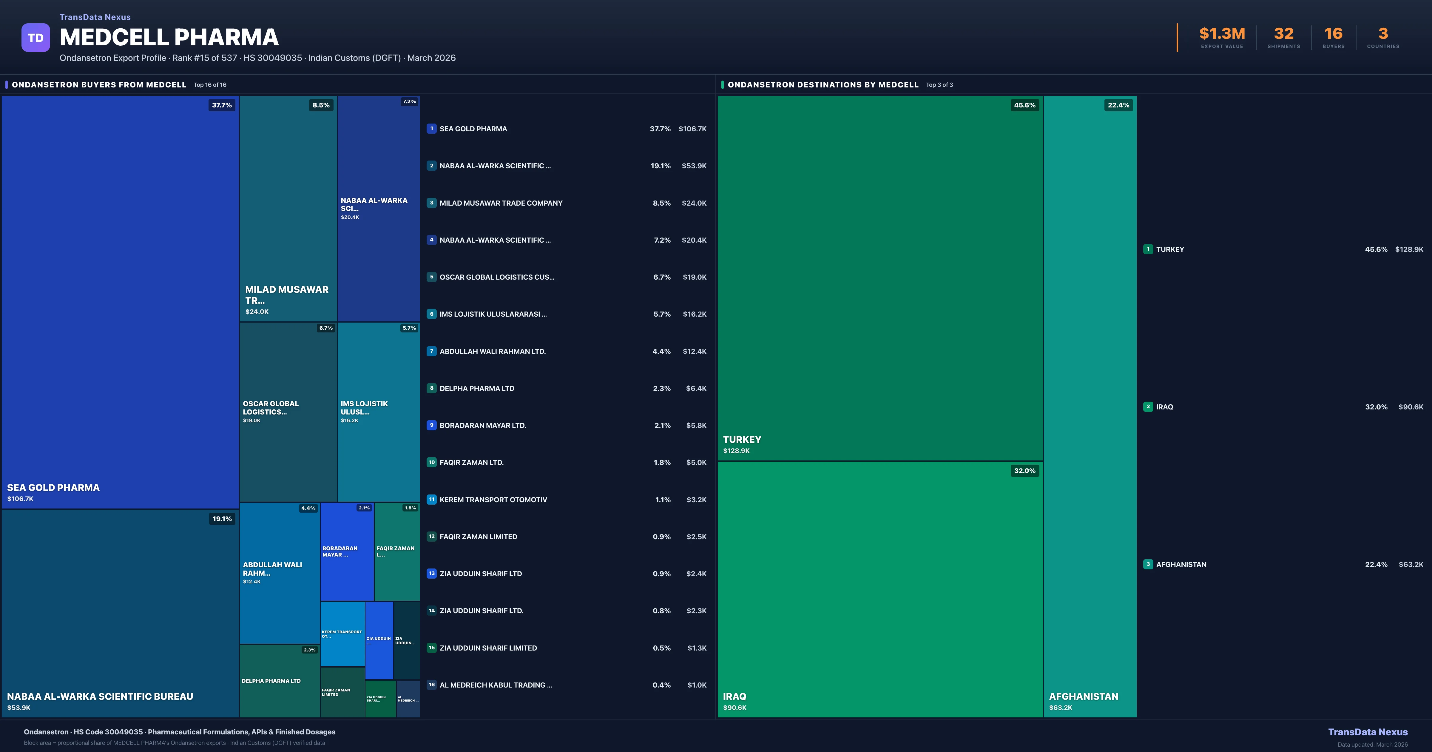Medcell Pharma supplies Ondansetron to 16 buyers globally. The largest buyer is SEA GOLD PHARMA (TURKEY), followed by NABAA AL-WARKA SCIENTIFIC BUREAU (IRAQ) and MILAD MUSAWAR TRADE COMPANY (AFGHANISTAN). These buyers represent pharmaceutical distributors, hospital groups, and government procurement agencies in their respective markets.