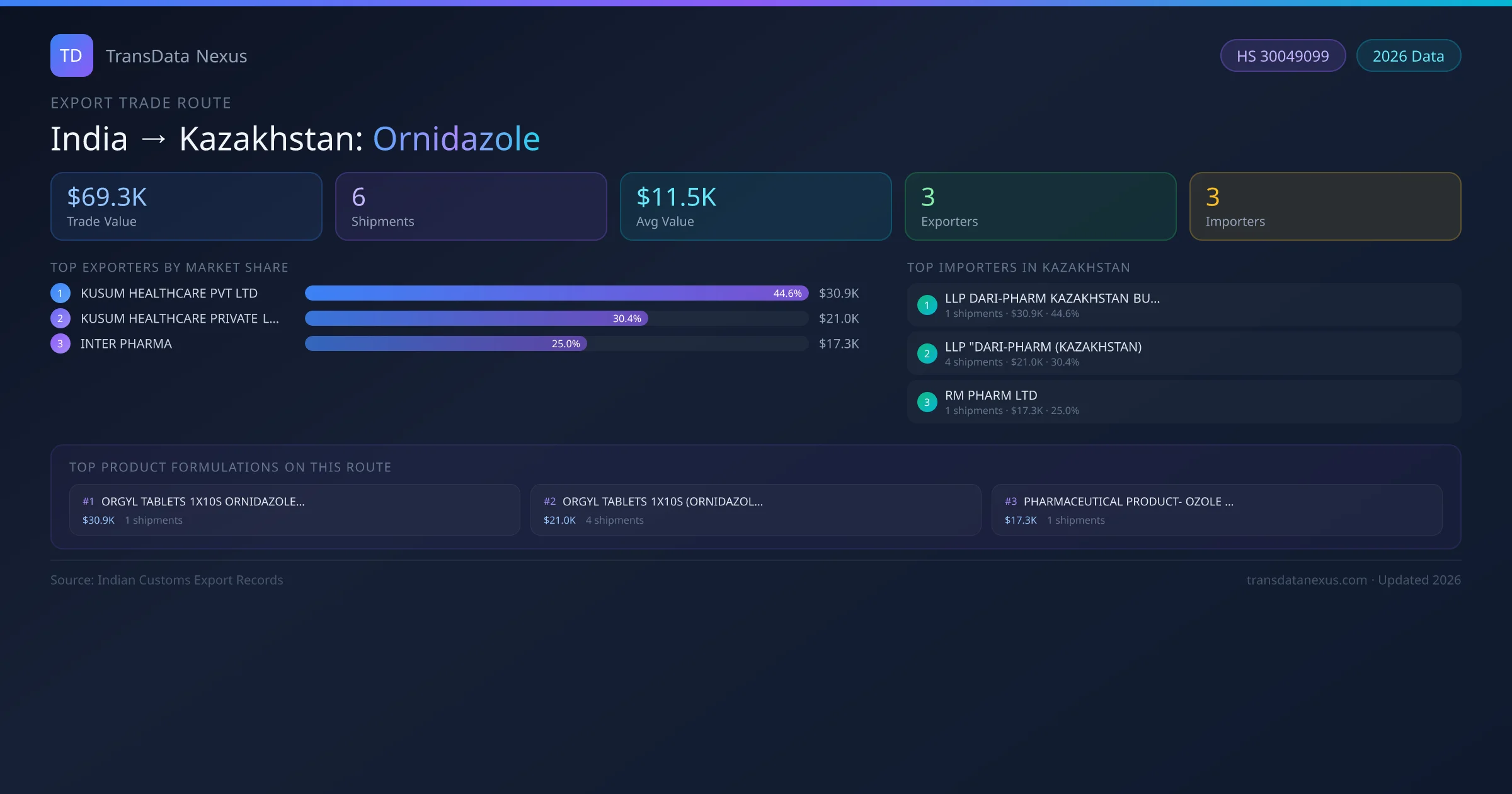 India has recorded 6 verified shipments of Ornidazole exported to Kazakhstan, representing a combined trade value of $69.3K USD. This corridor is served by 3 active Indian exporters, with an average shipment value of $11.5K USD. The leading Indian exporter is KUSUM HEALTHCARE PVT LTD, which accounts for 45% of total export value with 1 shipments worth $30.9K USD. On the buying side, LLP DARI-PHARM KAZAKHSTAN BUILDING is the largest importer in Kazakhstan with $30.9K USD in purchases. The top 3 suppliers — KUSUM HEALTHCARE PVT LTD, KUSUM HEALTHCARE PRIVATE LIMITED, INTER PHARMA — together control 100% of total trade value on this route. All data sourced from Indian Customs (DGFT) shipping bill records. Values reported in FOB USD.
