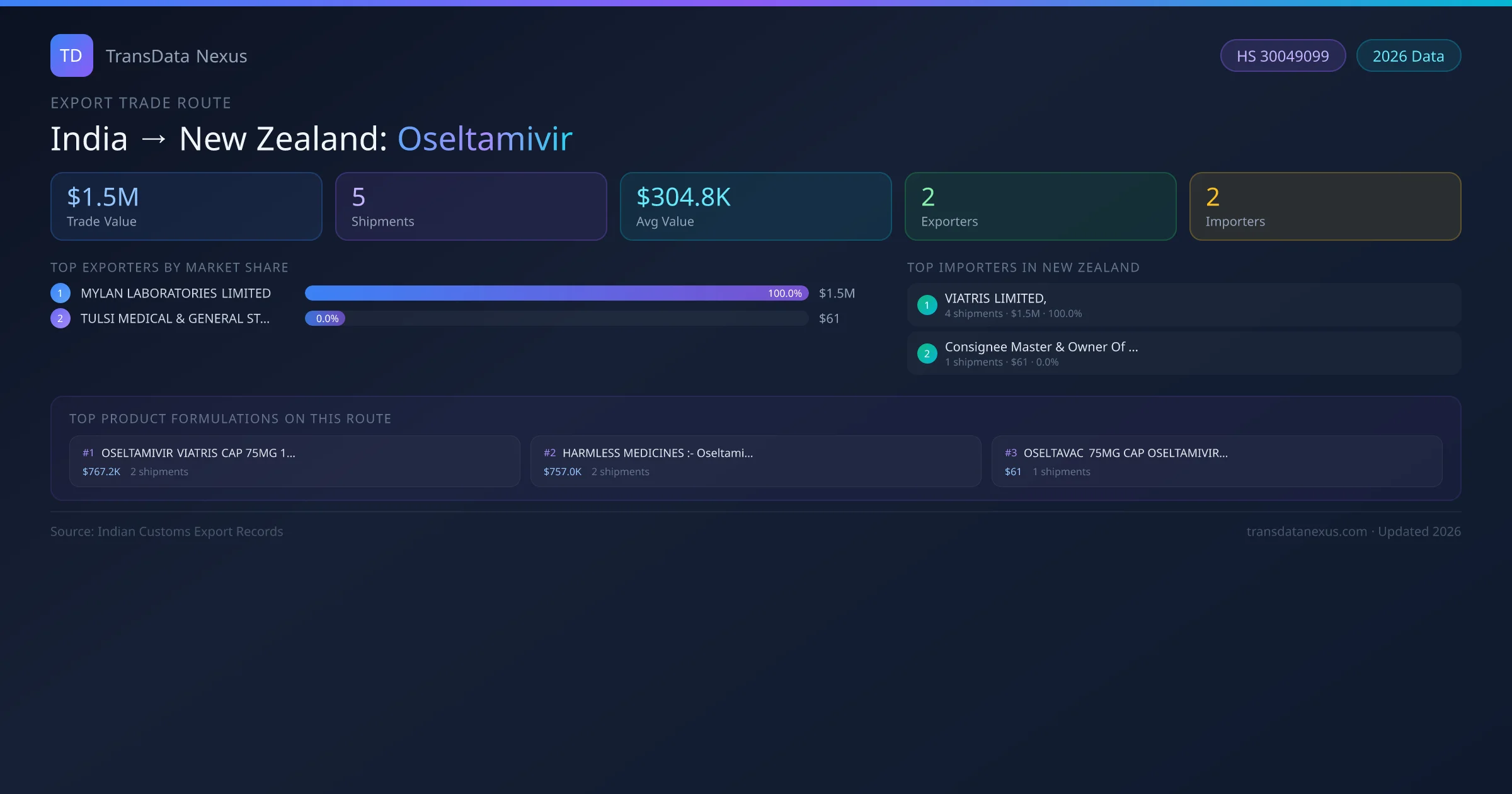 India has recorded 5 verified shipments of Oseltamivir exported to New Zealand, representing a combined trade value of $1.5M USD. This corridor is served by 2 active Indian exporters, with an average shipment value of $304.8K USD. The leading Indian exporter is MYLAN LABORATORIES LIMITED, which accounts for 100% of total export value with 4 shipments worth $1.5M USD. On the buying side, VIATRIS LIMITED, is the largest importer in New Zealand with $1.5M USD in purchases. All data sourced from Indian Customs (DGFT) shipping bill records. Values reported in FOB USD.