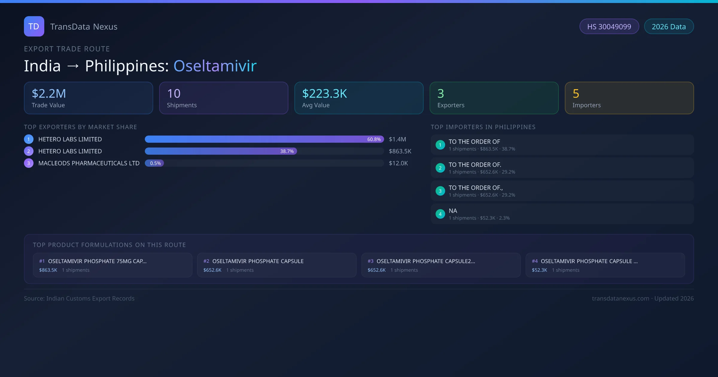 On the receiving end of this trade route, the leading importers of Indian oseltamivir in Philippines include TO THE ORDER OF, TO THE ORDER OF., TO THE ORDER OF.,, NA, MACLEODS PHARMACEUTICALS PHILIPPINE. The largest importer is TO THE ORDER OF, accounting for $863.5K USD across 1 shipments — representing 39% of all oseltamivir imports from India on this route.
