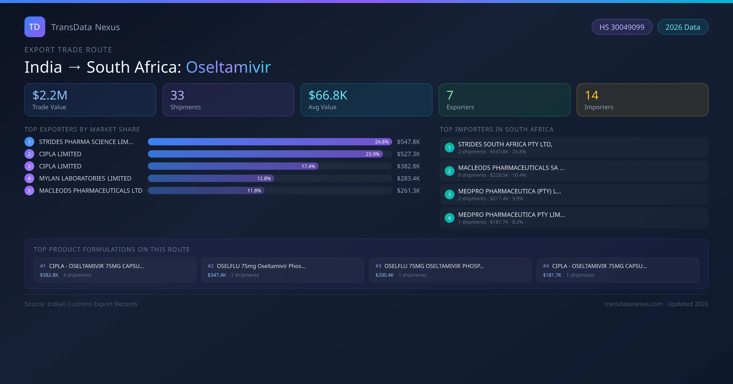 The leading Indian exporters of Oseltamivir to South Africa are STRIDES PHARMA SCIENCE LIMITED, CIPLA LIMITED, CIPLA LIMITED . STRIDES PHARMA SCIENCE LIMITED holds the largest market share at approximately 25% of total trade value on this route.