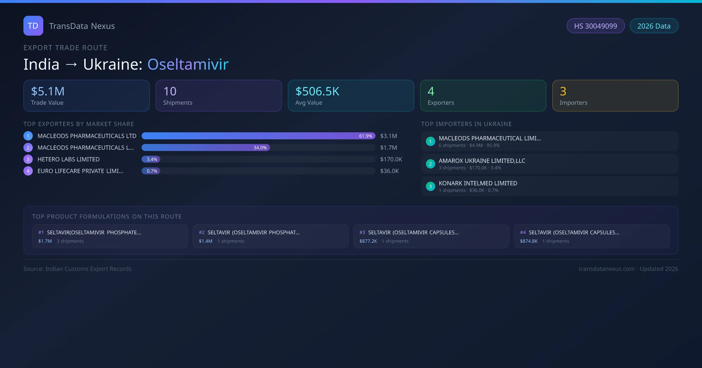 India has recorded 10 verified shipments of Oseltamivir exported to Ukraine, representing a combined trade value of $5.1M USD. This corridor is served by 4 active Indian exporters, with an average shipment value of $506.5K USD. The leading Indian exporter is MACLEODS PHARMACEUTICALS LTD, which accounts for 62% of total export value with 3 shipments worth $3.1M USD. On the buying side, MACLEODS PHARMACEUTICAL LIMITED LLC is the largest importer in Ukraine with $4.9M USD in purchases. The top 3 suppliers — MACLEODS PHARMACEUTICALS LTD, MACLEODS PHARMACEUTICALS LIMITED, HETERO LABS LIMITED — together control 99% of total trade value on this route. All data sourced from Indian Customs (DGFT) shipping bill records. Values reported in FOB USD.