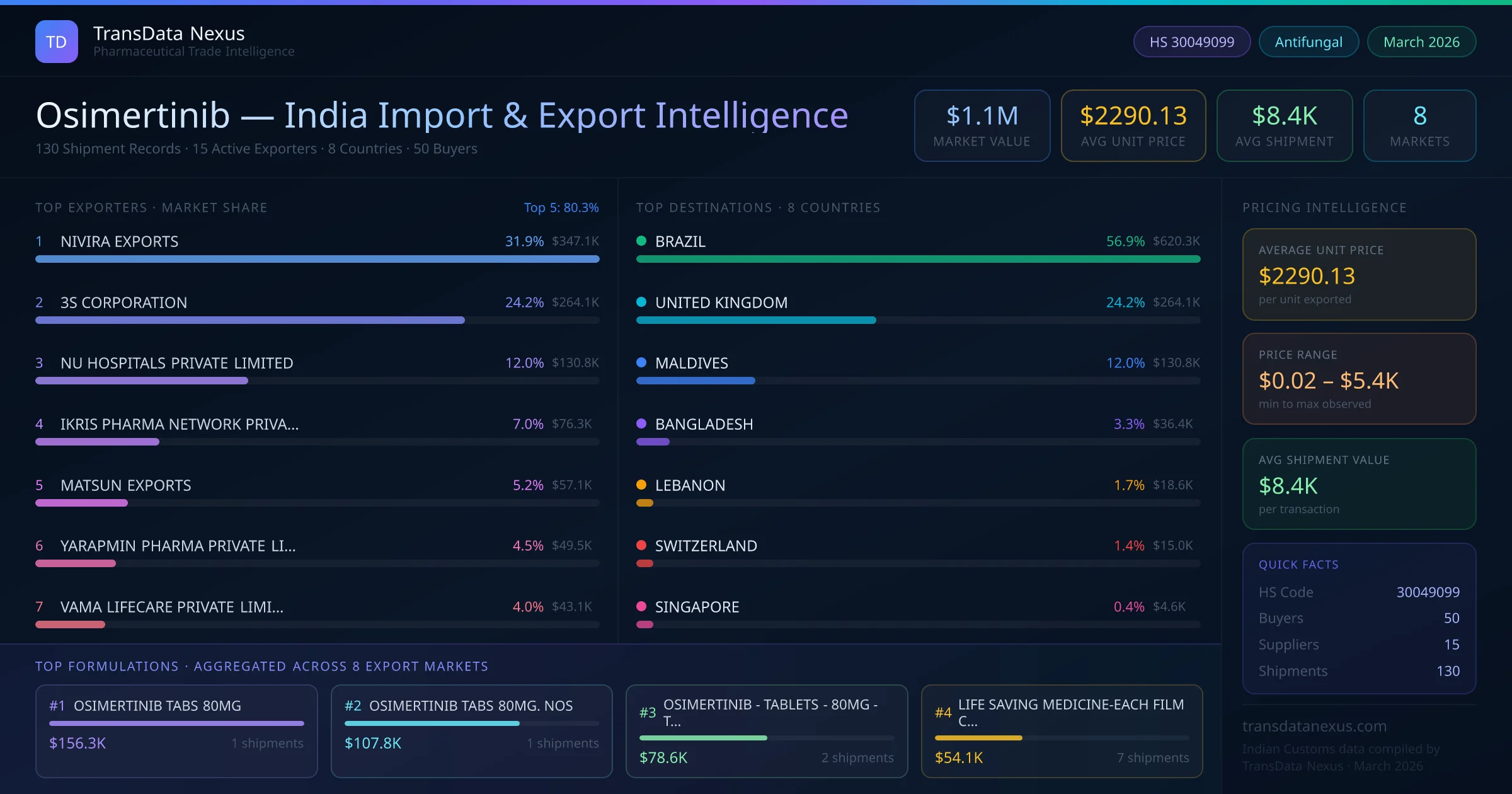 The total export value of osimertinib from India is $1.1M, recorded across 130 shipments from 15 active exporters to 8 countries. The average shipment value is $8.4K.
