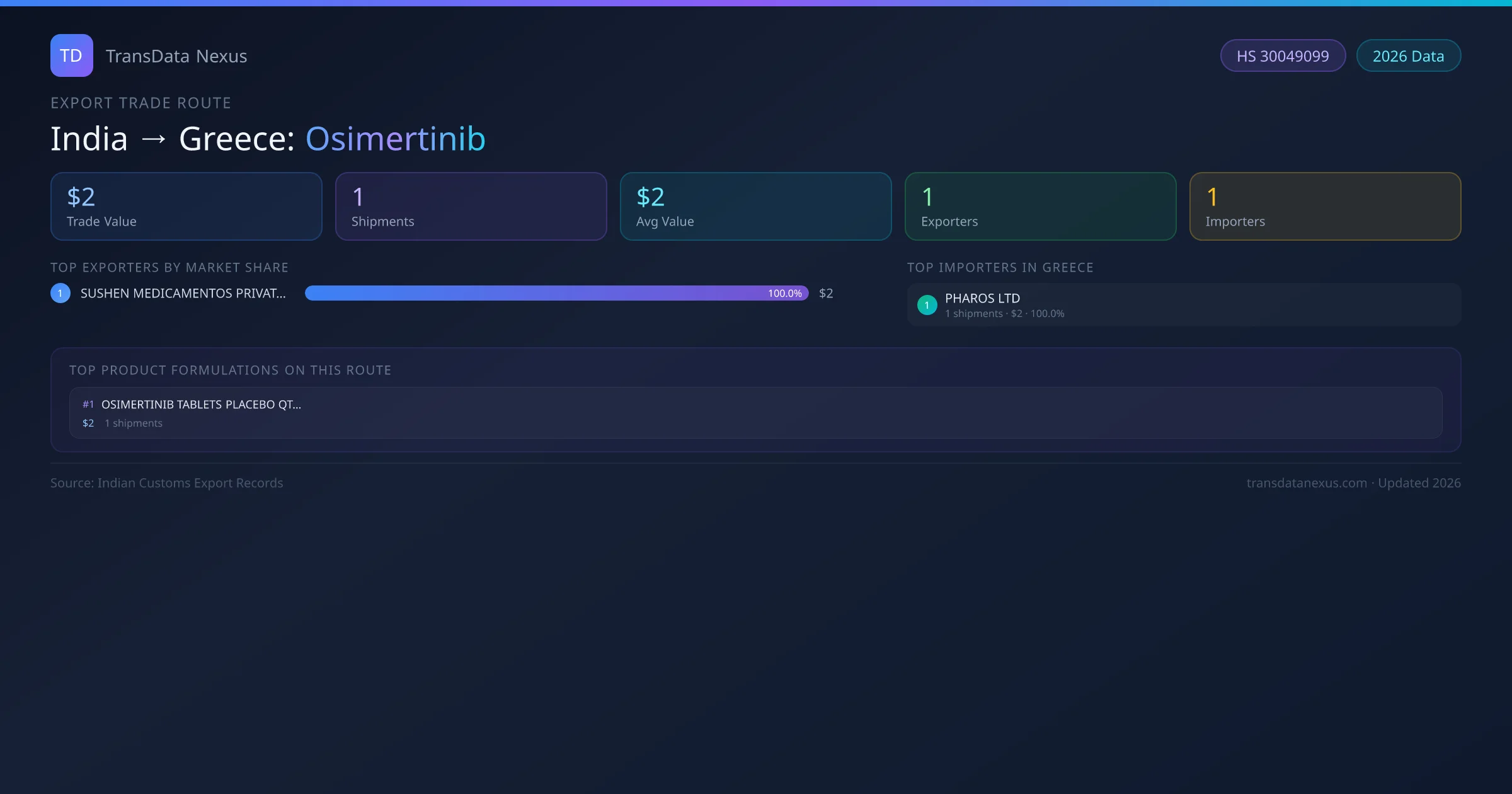 India exports Osimertinib to Greece worth approximately $2 USD across 1 recorded shipments. The average value per shipment is $2 USD.