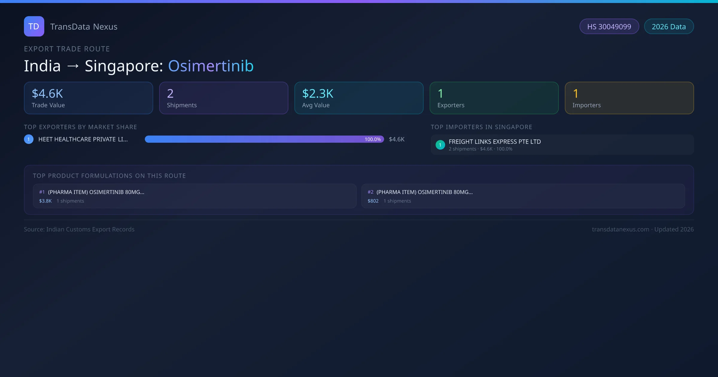 India exports Osimertinib to Singapore worth approximately $4.6K USD across 2 recorded shipments. The average value per shipment is $2.3K USD.