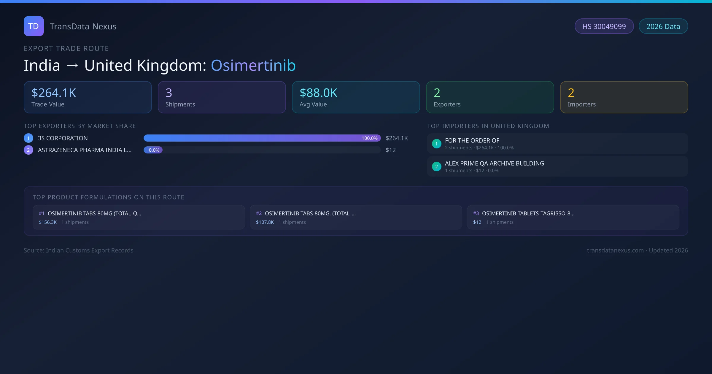 India has recorded 3 verified shipments of Osimertinib exported to United Kingdom, representing a combined trade value of $264.1K USD. This corridor is served by 2 active Indian exporters, with an average shipment value of $88.0K USD. The leading Indian exporter is 3S CORPORATION, which accounts for 100% of total export value with 2 shipments worth $264.1K USD. On the buying side, FOR THE ORDER OF is the largest importer in United Kingdom with $264.1K USD in purchases. All data sourced from Indian Customs (DGFT) shipping bill records. Values reported in FOB USD.