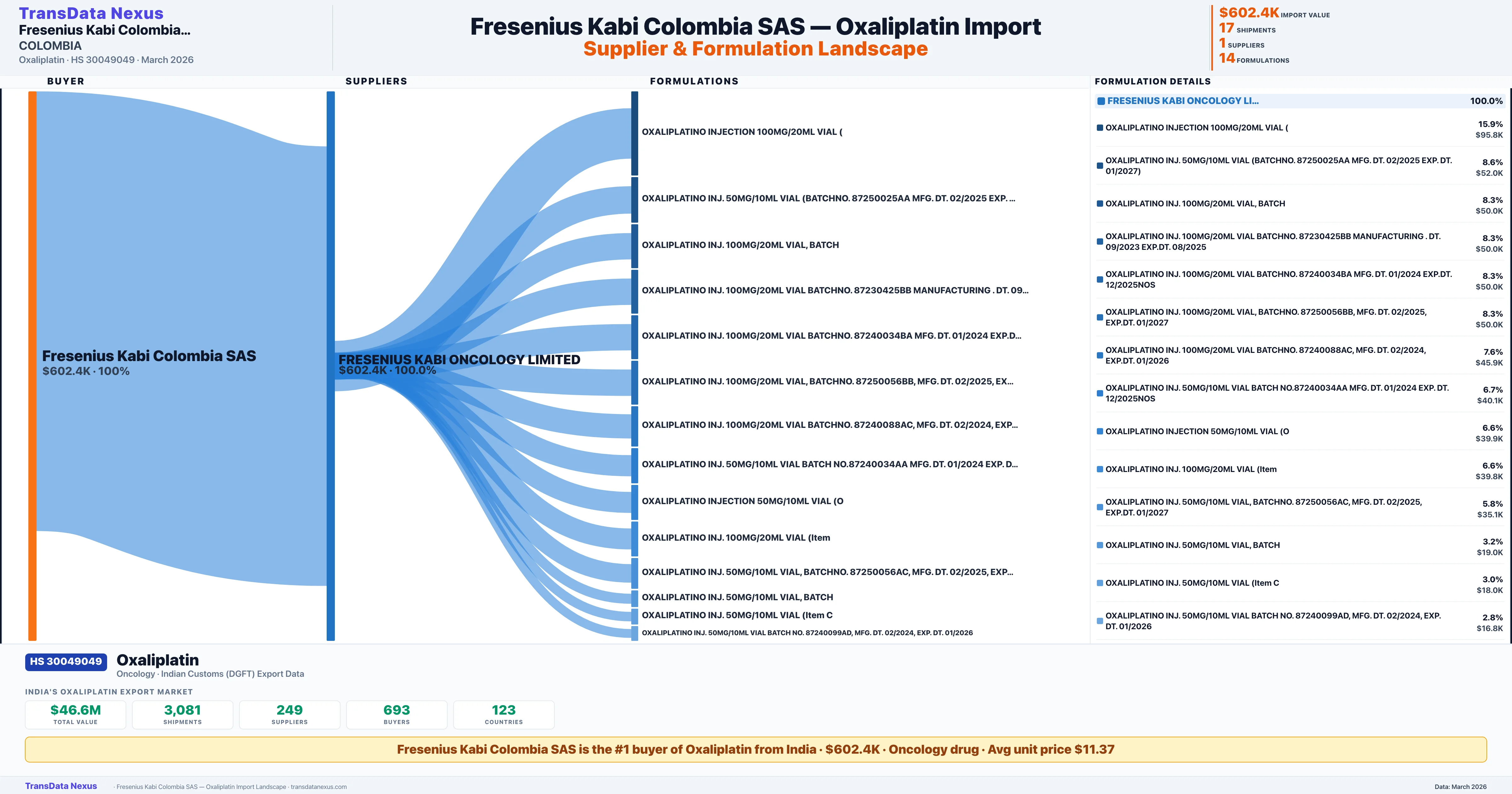 Access order-level details, pricing data, supplier connections, and competitive analysis for FRESENIUS KABI COLOMBIA SAS's Oxaliplatin imports. TransData Nexus provides verified Indian Customs (DGFT) data trusted by pharmaceutical trade professionals worldwide.